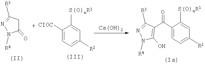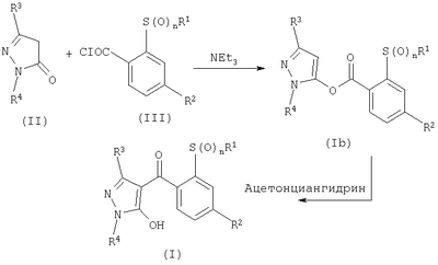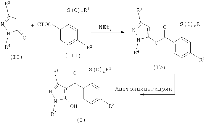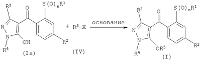 Соединения согласно настоящему изобретению, в которых R5 – водород, можно, например, получить по указанному на схеме 1 и известному из DOS 2513750 способу путем катализируемого основаниями взаимодействия галогенанидрида бензойной кислоты с пиразолоном или по указанному на схеме 2 и известному из ЕР-А 0186117 способу путем катализируемого основаниями взаимодействия галогенангидрида бензойной кислоты с пиразолоном и последующего превращения.