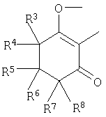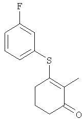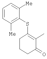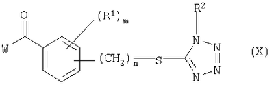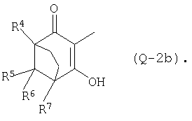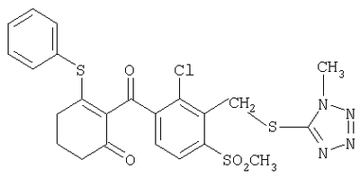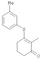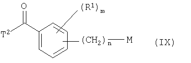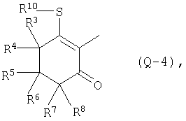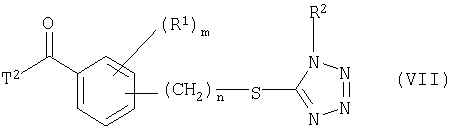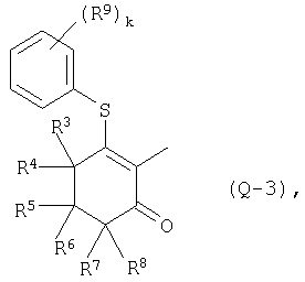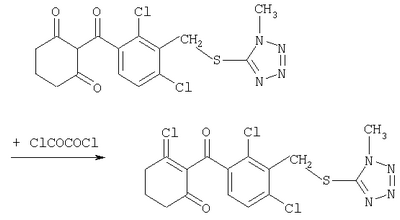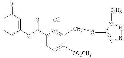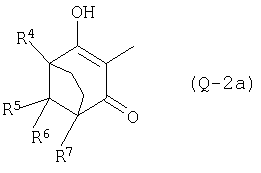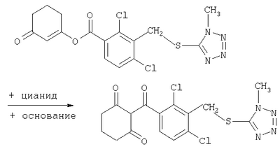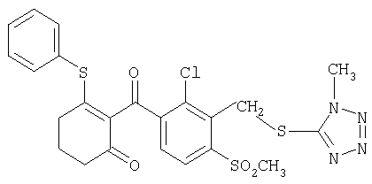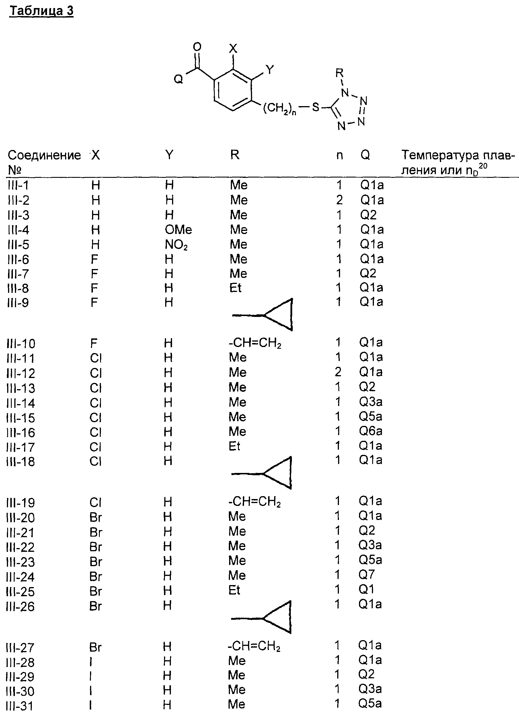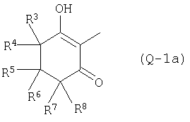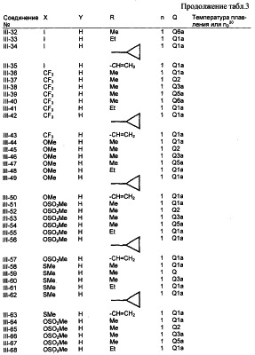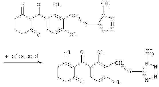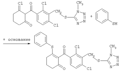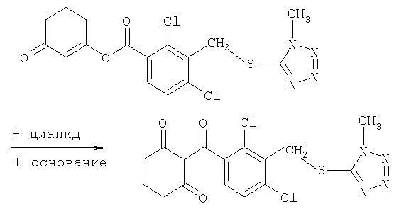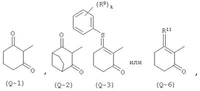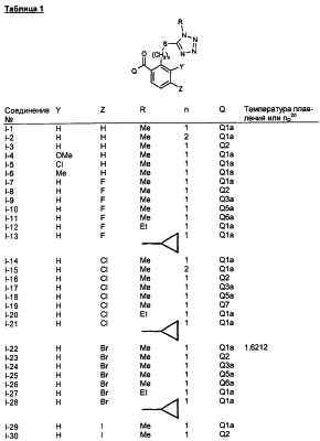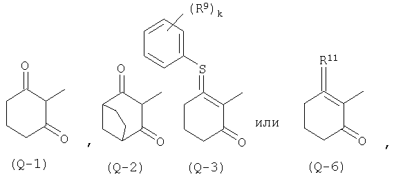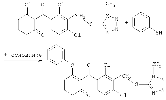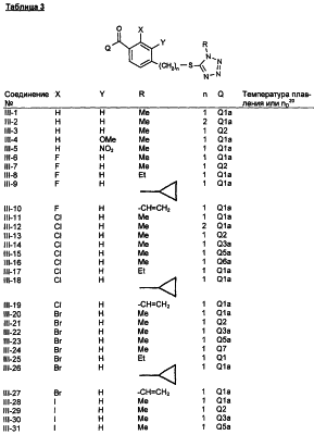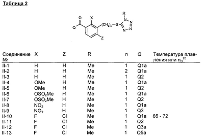 где Qa означает одну из следующих групп или где R3, R4, R5, R6, R7 и R8 являются такими, как определено выше, в подходящем растворителе, например дихлорметане, в присутствии подходящего конденсирующего реагента, например триэтиламина. Соединения формулы (IV), использующиеся в указанных выше реакциях, также являются новыми соединениями, которые до настоящего времени не были описаны в литературе, и их можно получить, например, по реакции соединений формулы (VI) где R1, R2, m и n являются такими, как определено выше, с галогенирующим реагентом, например оксихлоридом фосфора, оксибромидом фосфора, трихлоридом фосфора, трибромидом фосфора, фосгеном, оксалилдихлоридом, тионилхлоридом, тионилбромидом. Соединения формулы (V), использующиеся в качестве исходных веществ при получении соединений указанной выше формулы (II), сами по себе известны и имеются в продаже или же их можно легко получить в соответствии со способами, описанными в различных публикациях (например в публикациях патентных заявок Японии №6425/1990, №265415/1998, №265441/1998). Соединения формулы (VI), использующиеся при получении соединений указанной выше формулы (IV), также являются новыми соединениями, которые до настоящего времени не были описаны в литературе, и их можно легко получить, например, путем гидролиза соединений формулы (VII) где R1, R2, m и n являются такими, как определено выше, и Т2 означает С1-4-алкоксил, предпочтительно -метоксил или этоксил, в подходящем растворителе, например в водном растворе диоксана, в присутствии подходящего основания, например гидроксида натрия. Соединения указанной выше формулы (VII) также являются новыми соединениями и их можно легко получить, например, по реакции соединений формулы (VIII) где R2 являются такими, как определено выше, с соединениями формулы (IX) где R1, m и n являются такими, как определено выше, Т2 означает C1-4-алкил, предпочтительно метил или этил, и М означает галоген, в подходящем растворителе, например N,N-диметилформамиде, в присутствии подходящего конденсирующего реагента, например карбоната калия. Соединения указанной выше формулы (VIII) являются известными соединениями, описанными, например, в Berichte Vol.28, р.74-76 (1895), и их можно легко получить в соответствии со способами, описанными в указанной публикации. С другой стороны, соединения указанной выше формулы (IX), часть из которых является новыми соединениями, которые до настоящего времени не были описаны в литературе, можно легко получить в соответствии со способом, описанным, например, в публикации патентной заявки Японии №173/1990. Соединения формулы (II), исходные вещества в указанном выше способе получения (а), также можно легко получить из соединений указанной выше формулы (VI) в соответствии со способом, описанным, например, в WO 93/18031. В качестве типичных примеров соединений формулы (II), использующихся в качестве исходных веществ в указанном выше способе получения (а), можно указать следующие: 3-оксо-1-циклогексенил-2-{[(1-метил-1Н-тетразол-5-ил)-тио]-метил}-бензоат, 3-оксо-1-циклогексенил-2-{[(1-циклопропил-1Н-тетразол-5-ил)-тио]-метил}-4-фторбензоат, 3-оксо-1-циклогексенил-4-хлор-2-{[(1-метил-1Н-тетразол-5-ил)-тио]-метил}-бензоат, 3-оксо-1-циклогексенил-4-хлор-2-{[(1-этил-1Н-тетразол-5-ил)-тио]-метил}-бензоат, 3-оксо-1-циклогексенил-4-хлор-2-{[(1-циклопропил-1Н-тетразол-5-ил)-тио]-метил}-бензоат, 3-оксо-1-циклогексенил-2-бром-4-{[(1-метил-1Н-тетразол-5-ил)-т