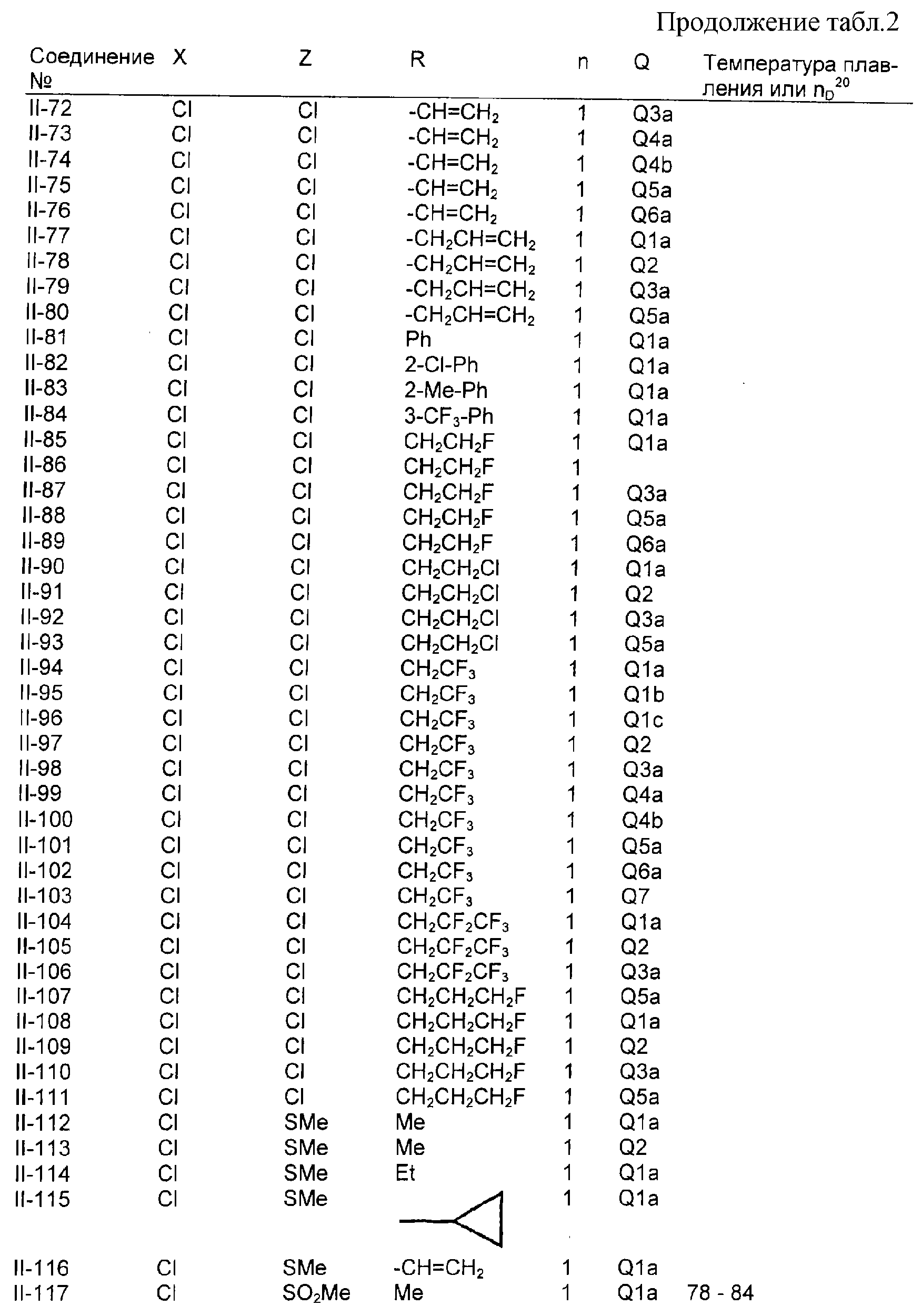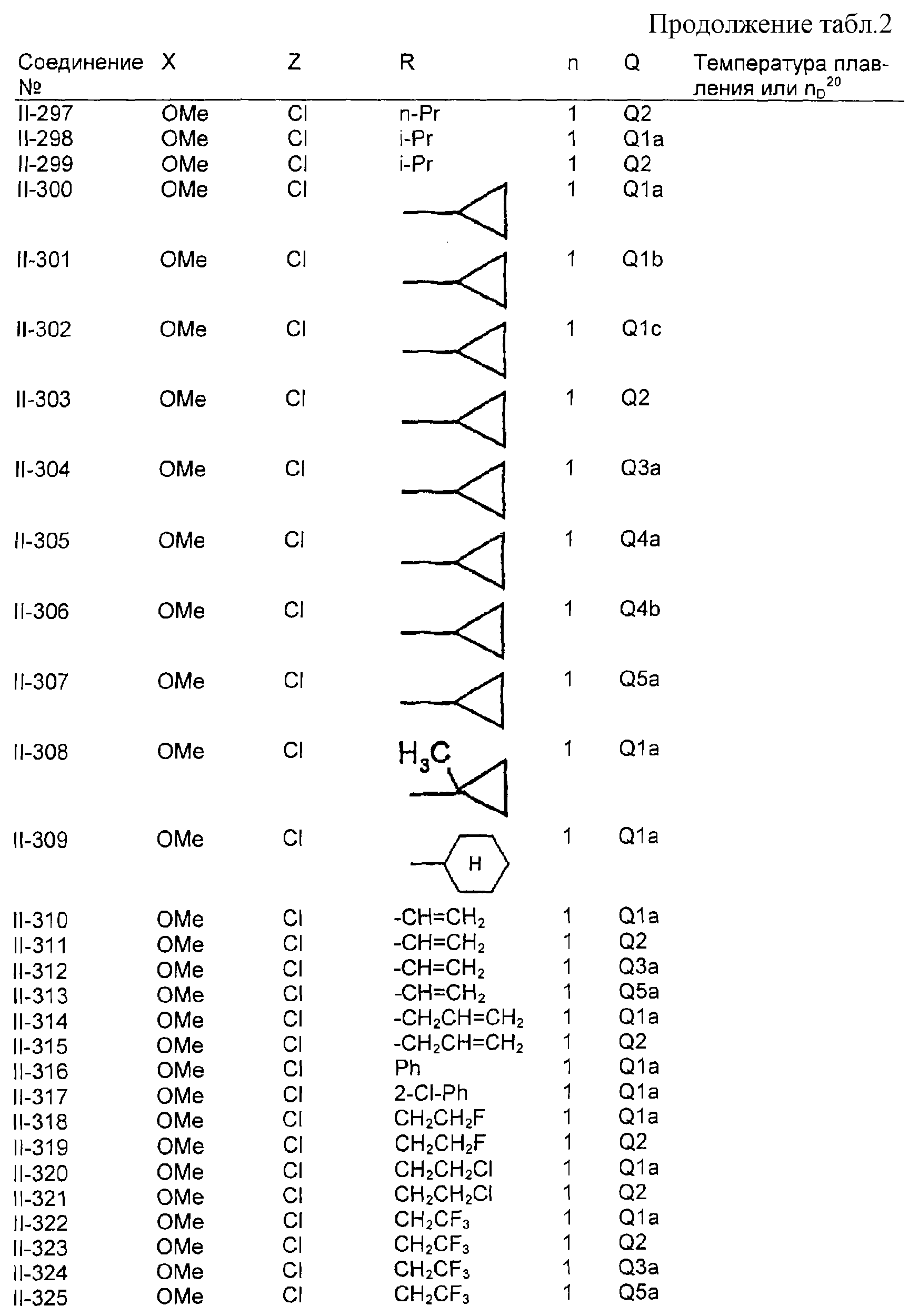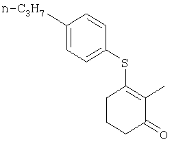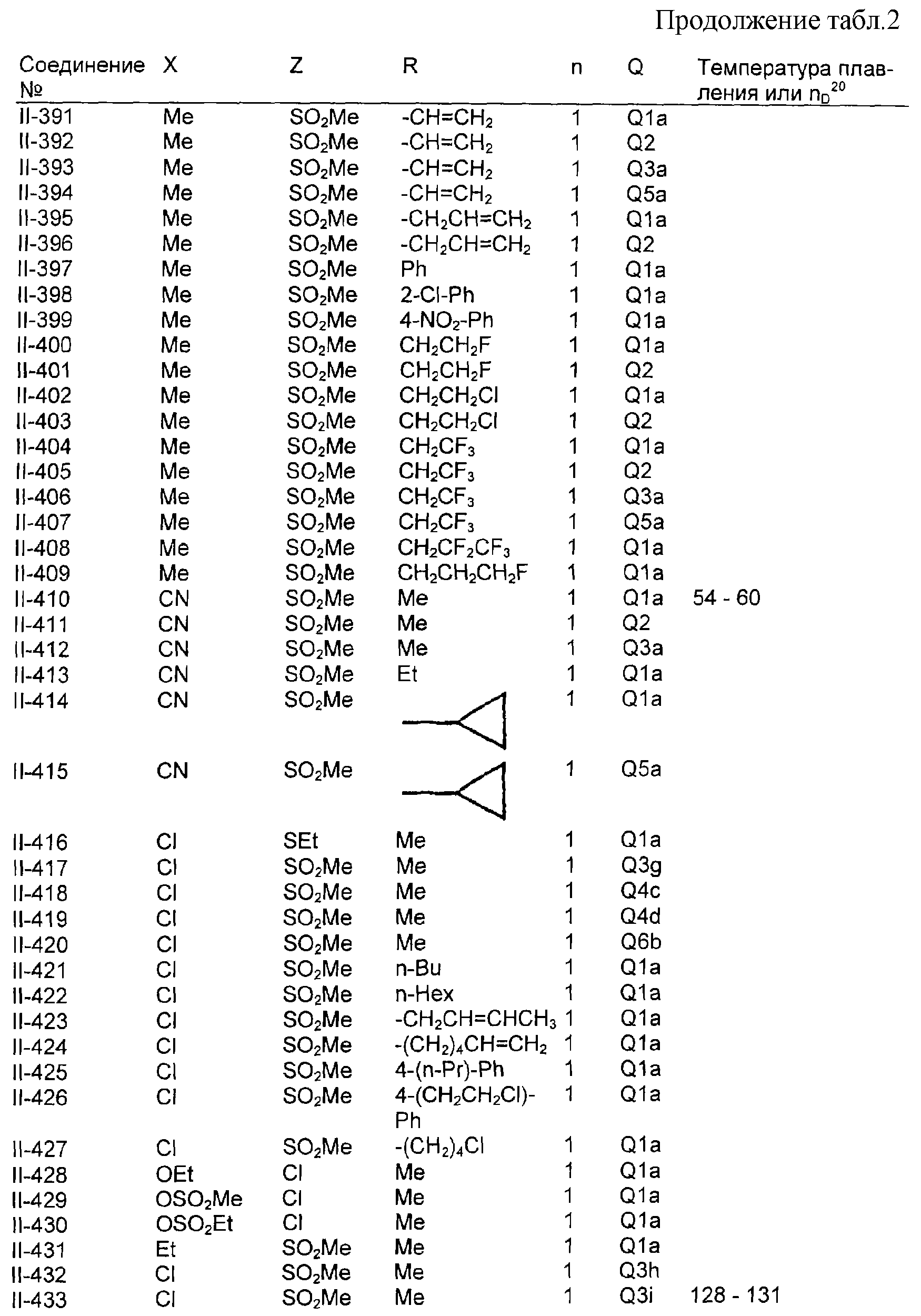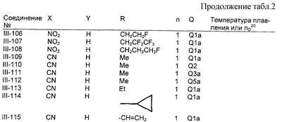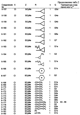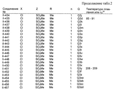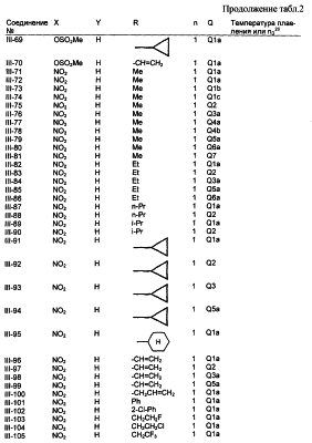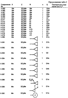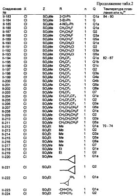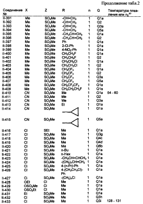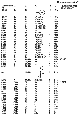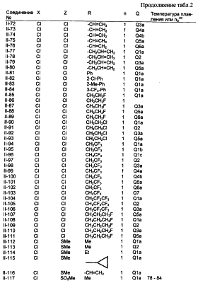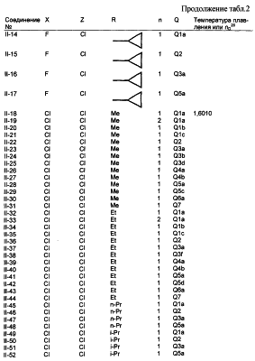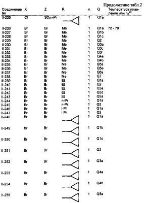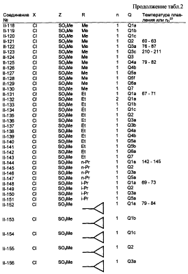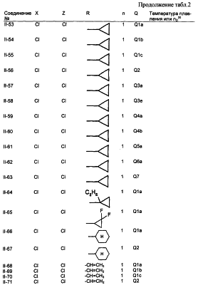 Пример композиции 1 (гранулы) К смеси соединения № II-18, соответствующего настоящему изобретению (2,5 ч.), бентонита (монтмориллонита) (30 ч.), талька (65,5 ч.) и лигнилсульфонатной соли (2 ч.) прибавляют воду (25 ч.). Смесь тщательно перемешивают и с помощью экструзионного гранулятора формуют гранулы размера 10-40 меш и для получения гранул сушат при 40-50°С. Пример композиции 2 (гранулы) Измельченную глину с размером частиц 0,2-2 мм (95 ч.) помещают в ротационный смеситель. Во время его работы в смеситель разбрызгивают соединение № II-117, соответствующее настоящему изобретению (5 ч.), совместно с жидким разбавителем, обеспечивая равномерное смачивание и для получения гранул сушат при 40-50°С. Пример композиции 3 (эмульгируемый концентрат) Соединение № II-122, соответствующее настоящему изобретению (30 ч.), ксилол (5 ч.), полиоксиэтиленалкилфениловый простой эфир (8 ч.) и алкилбензолсульфонат кальция (7 ч.) смешивают и перемешивают до образования эмульсии. Пример композиции 4 (смачивающийся порошок) Соединение № II-194, соответствующее настоящему изобретению (15 ч.), смесь “белой сажи” (тонкоизмельченный порошкообразный водный аморфный оксид кремния) и порошкообразной глины (1:5) (80 ч.), алкилбензолсульфонат натрия (2 ч.) и сополимер алкилнафталинсульфоната натрия с формалином (3 ч.) перемешивают в порошкообразном виде и превращают в смачивающийся порошок. Пример композиции 5 (диспергирующиеся в воде гранулы) Соединение № II-18, соответствующее настоящему изобретению (20 ч.), лигнинсульфонат натрия (30 ч.), бентонит (15 ч.) и прокаленную порошкообразную диатомовую землю (35 ч.) тщательно перемешивают, прибавляют воду, экструдируют с использованием сита с размером ячеек 0,3 мм и сушат, получая диспергирующиеся в воде гранулы.