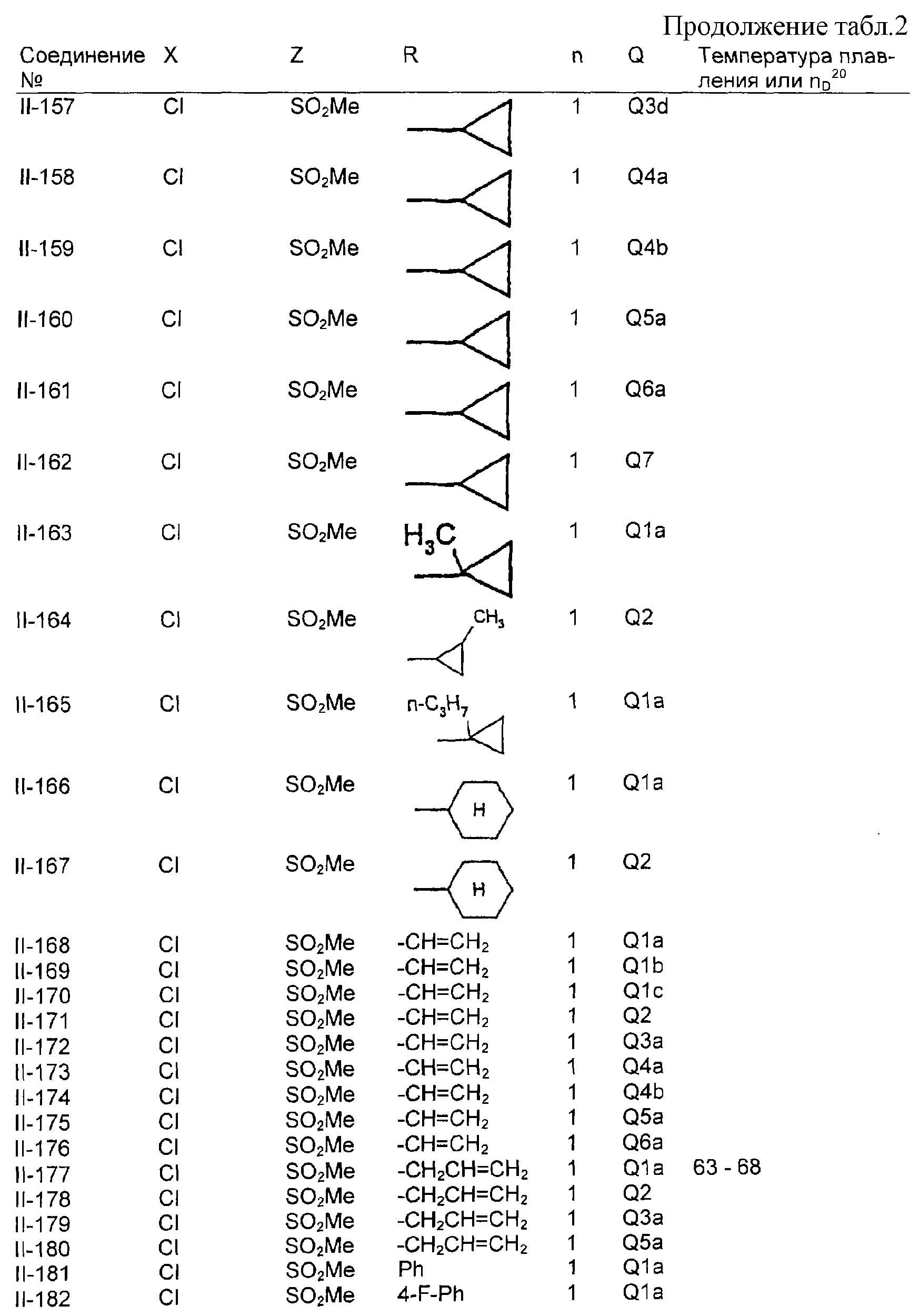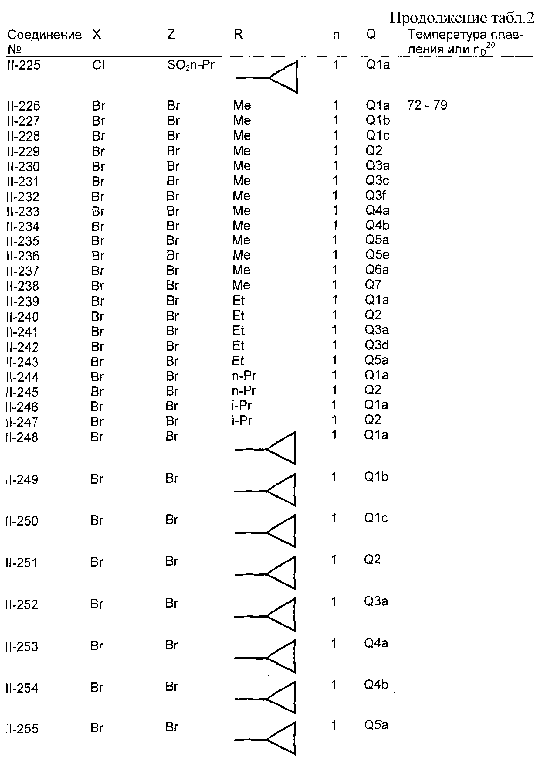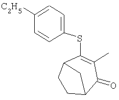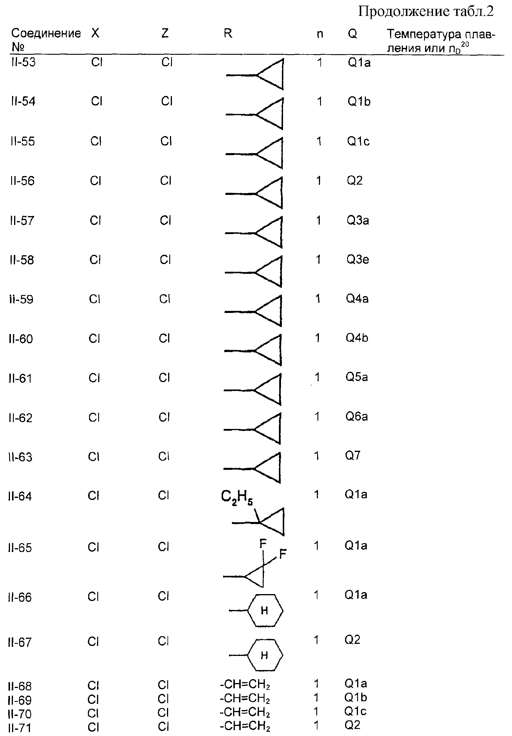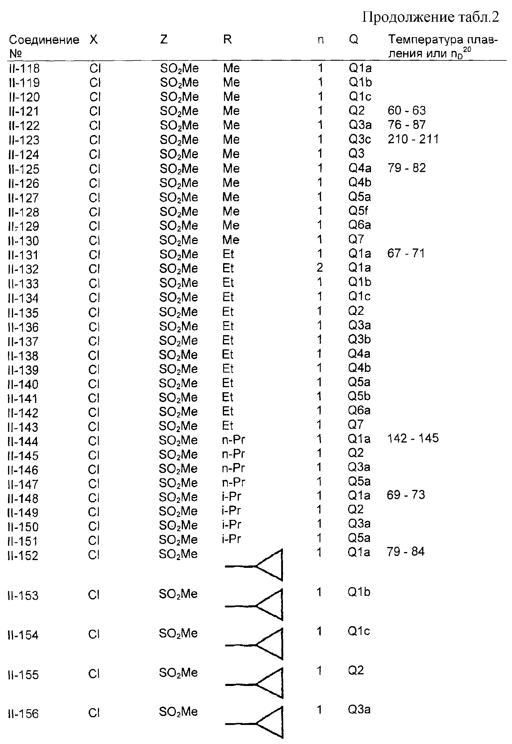 Пример композиции 1 (гранулы) К смеси соединения № II-18, соответствующего настоящему изобретению (2,5 ч.), бентонита (монтмориллонита) (30 ч.), талька (65,5 ч.) и лигнилсульфонатной соли (2 ч.) прибавляют воду (25 ч.). Смесь тщательно перемешивают и с помощью экструзионного гранулятора формуют гранулы размера 10-40 меш и для получения гранул сушат при 40-50°С. Пример композиции 2 (гранулы) Измельченную глину с размером частиц 0,2-2 мм (95 ч.) помещают в ротационный смеситель. Во время его работы в смеситель разбрызгивают соединение № II-117, соответствующее настоящему изобретению (5 ч.), совместно с жидким разбавителем, обеспечивая равномерное смачивание и для получения гранул сушат при 40-50°С. Пример композиции 3 (эмульгируемый концентрат) Соединение № II-122, соответствующее настоящему изобретению (30 ч.), ксилол (5 ч.), полиоксиэтиленалкилфениловый простой эфир (8 ч.) и алкилбензолсульфонат кальция (7 ч.) смешивают и перемешивают до образования эмульсии. Пример композиции 4 (смачивающийся порошок) Соединение № II-194, соответствующее настоящему изобретению (15 ч.), смесь “белой сажи” (тонкоизмельченный порошкообразный водный аморфный оксид кремния) и порошкообразной глины (1:5) (80 ч.), алкилбензолсульфонат натрия (2 ч.) и сополимер алкилнафталинсульфоната натрия с формалином (3 ч.) перемешивают в порошкообразном виде и превращают в смачивающийся порошок. Пример композиции 5 (диспергирующиеся в воде гранулы) Соединение № II-18, соответствующее настоящему изобретению (20 ч.), лигнинсульфонат натрия (30 ч.), бентонит (15 ч.) и прокаленную порошкообразную диатомовую землю (35 ч.) тщательно перемешивают, прибавляют воду, экструдируют с использованием сита с размером ячеек 0,3 мм и сушат, получая диспергирующиеся в воде гранулы.
