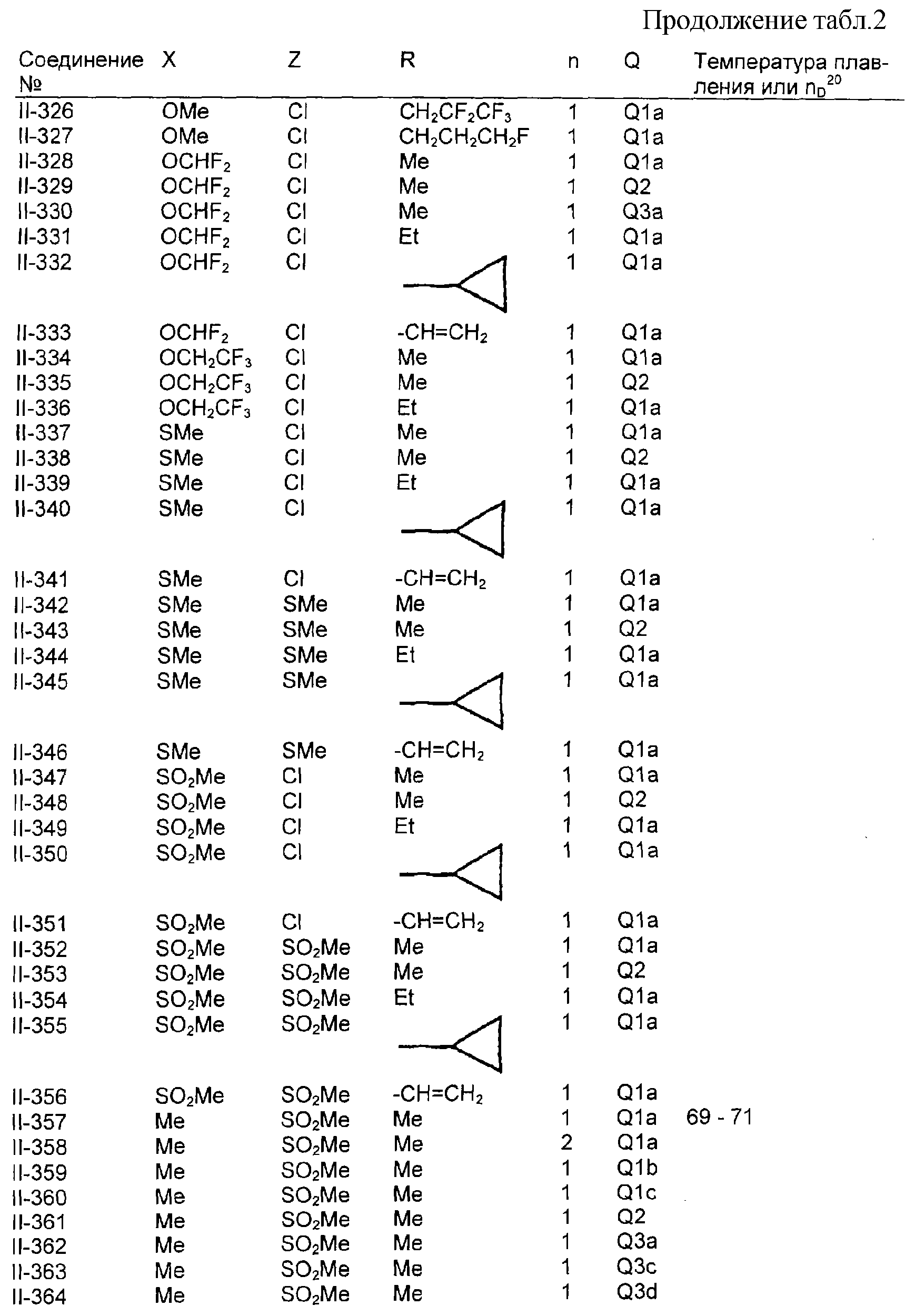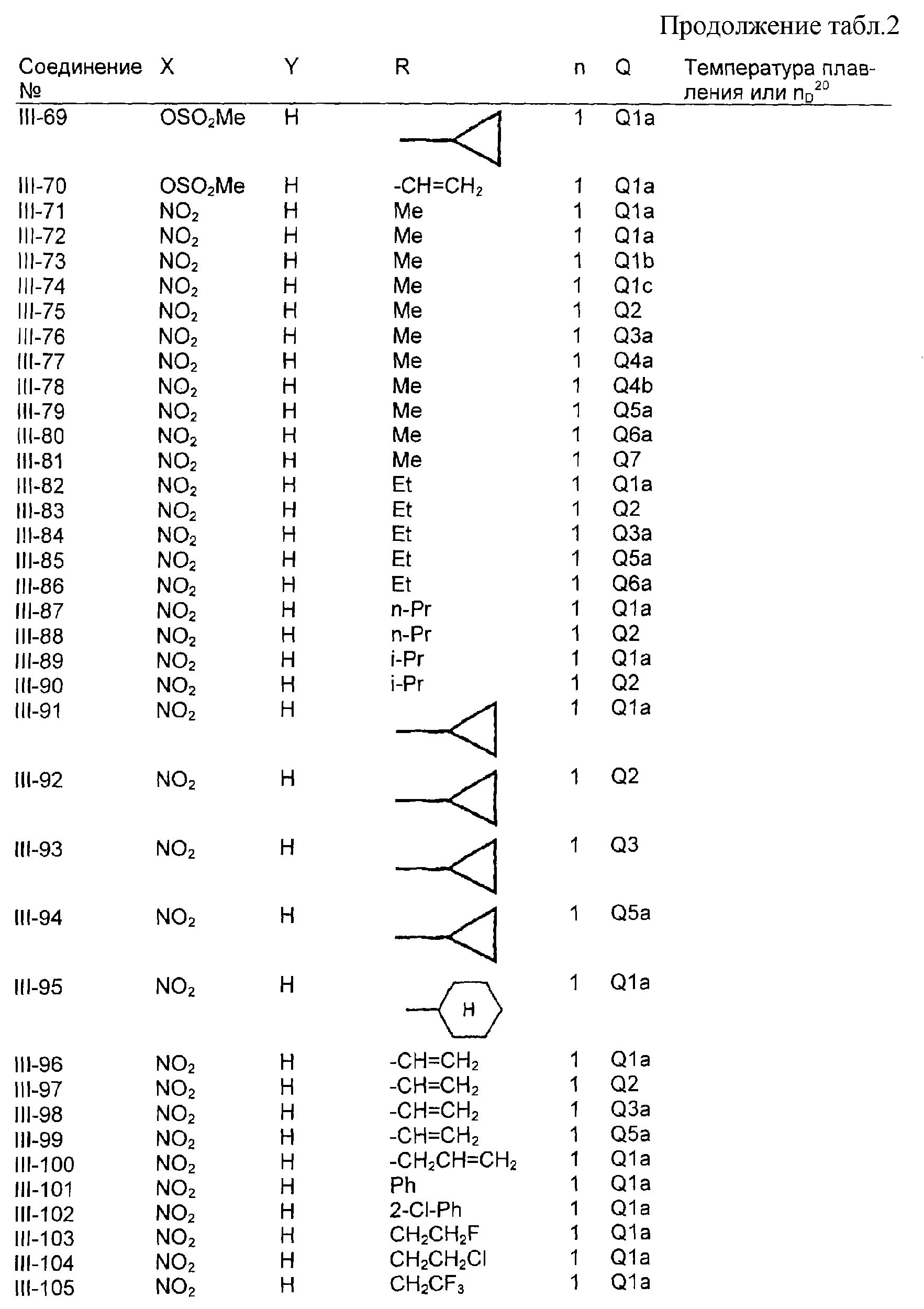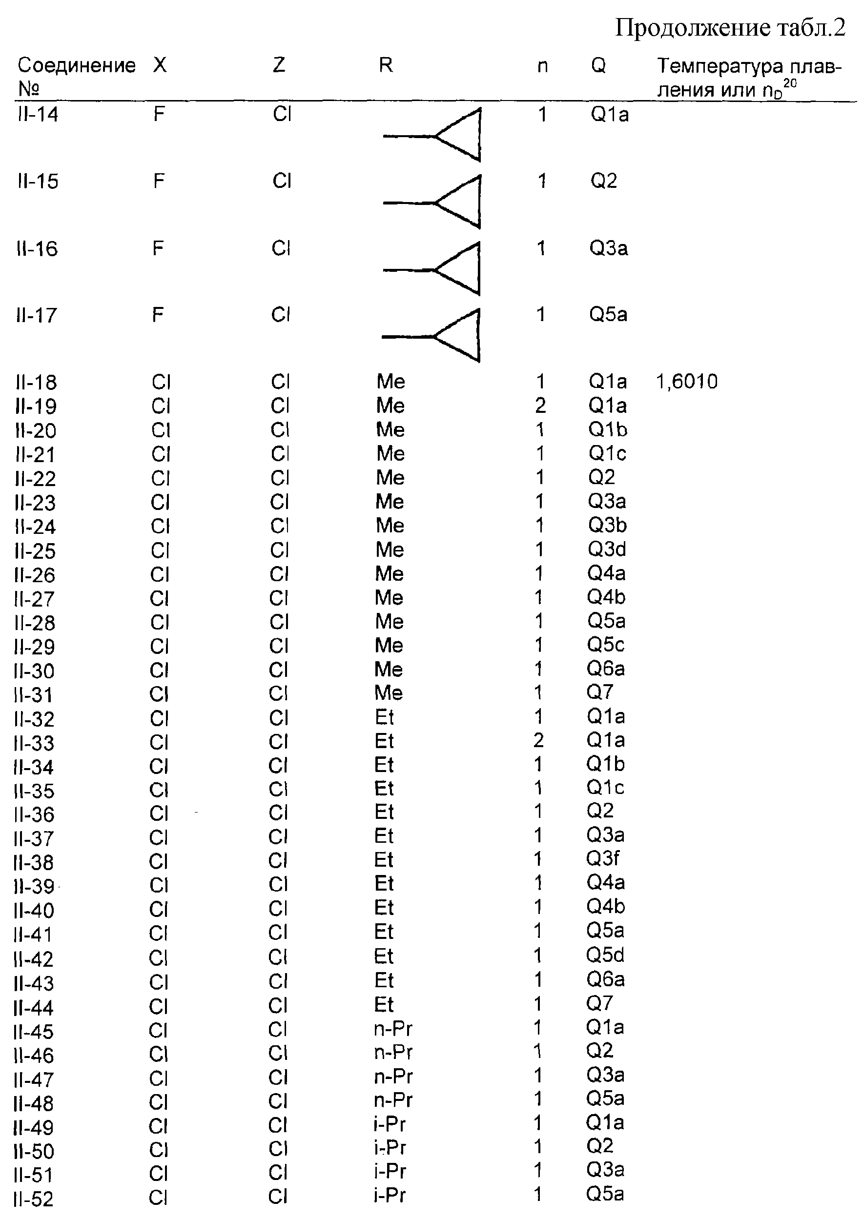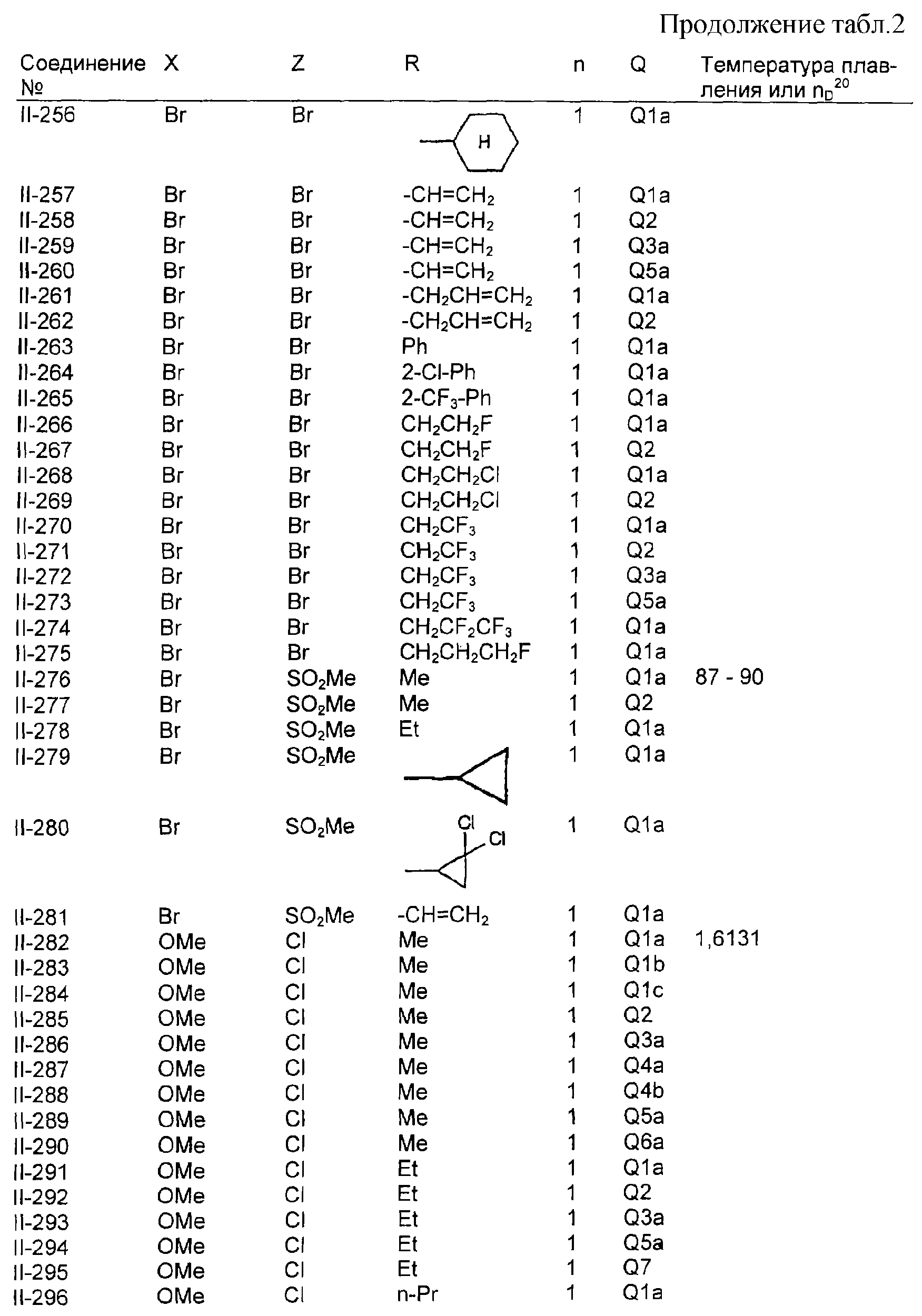 Пример композиции 1 (гранулы) К смеси соединения № II-18, соответствующего настоящему изобретению (2,5 ч.), бентонита (монтмориллонита) (30 ч.), талька (65,5 ч.) и лигнилсульфонатной соли (2 ч.) прибавляют воду (25 ч.). Смесь тщательно перемешивают и с помощью экструзионного гранулятора формуют гранулы размера 10-40 меш и для получения гранул сушат при 40-50°С. Пример композиции 2 (гранулы) Измельченную глину с размером частиц 0,2-2 мм (95 ч.) помещают в ротационный смеситель. Во время его работы в смеситель разбрызгивают соединение № II-117, соответствующее настоящему изобретению (5 ч.), совместно с жидким разбавителем, обеспечивая равномерное смачивание и для получения гранул сушат при 40-50°С. Пример композиции 3 (эмульгируемый концентрат) Соединение № II-122, соответствующее настоящему изобретению (30 ч.), ксилол (5 ч.), полиоксиэтиленалкилфениловый простой эфир (8 ч.) и алкилбензолсульфонат кальция (7 ч.) смешивают и перемешивают до образования эмульсии. Пример композиции 4 (смачивающийся порошок) Соединение № II-194, соответствующее настоящему изобретению (15 ч.), смесь “белой сажи” (тонкоизмельченный порошкообразный водный аморфный оксид кремния) и порошкообразной глины (1:5) (80 ч.), алкилбензолсульфонат натрия (2 ч.) и сополимер алкилнафталинсульфоната натрия с формалином (3 ч.) перемешивают в порошкообразном виде и превращают в смачивающийся порошок. Пример композиции 5 (диспергирующиеся в воде гранулы) Соединение № II-18, соответствующее настоящему изобретению (20 ч.), лигнинсульфонат натрия (30 ч.), бентонит (15 ч.) и прокаленную порошкообразную диатомовую землю (35 ч.) тщательно перемешивают, прибавляют воду, экструдируют с использованием сита с размером ячеек 0,3 мм и сушат, получая диспергирующиеся в воде гранулы.