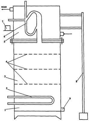 На чертеже показана установка для отгонки эфирного масла. Лабораторная установка для отгонки эфирного масла состоит из парогенератора 1 с находящимся внутри него теплоэлектрическим нагревателем 2 и установленной над ним перегонной камерой 3. В перегонной камере 3 на сетках 4 установлены кассеты для сырья. Над перегонной камерой установлен холодильник 5. Крышка перегонной камеры 3 является дном холодильника 5. Для герметизации корпуса камеры 3, между камерой 3 и холодильником в пазы укладывается уплотнительный элемент, например резиновый шнур. В холодильнике 5 установлена флорентина 6 и рядом с холодильником расположен маслосборник 7. Перегонная камера, холодильник и флорентина выполнены из нержавеющей стали. Поворотное устройство 8 соединено с холодильником 5 и предназначено для подъема и поворота холодильника в сторону. Поворотное устройство 8 обеспечивает удобную и ускоренную загрузку и разгрузку сырья в перегонную камеру 3. Для слива кубового остатка внизу парогенератора 1 выполнен отвод 9.