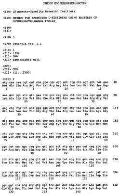 1. Бактерия, принадлежащая к роду Escherichia, – продуцент L-гистидина, обладающая повышенной активностью любого из ферментов, участвующих в превращении 5′-фосфорибозил-4-карбоксамид-5-аминоимидазола (AICAR) в инозин-5′-монофосфат (IMP). 2. Бактерия по п.1, отличающаяся тем, что указанная бактерия обладает повышенной активностью AICAR трансформилазы – IMP циклогидролазы. 3. Бактерия по п.2, отличающаяся тем, что активность AICAR трансформилазы – IMP циклогидролазы повышена путем увеличения экспрессии гена, кодирующего AICAR трансформилазу – IMP циклогидролазу. 4. Бактерия по п.З, отличающаяся тем, что активность AICAR трансформилазы – IMP циклогидролазы увеличена путем увеличения количества копий гена, кодирующего AICAR трансформилазу – IMP циклогидролазу, или путем изменения последовательности для регуляции экспрессии указанного гена таким образом, что экспрессия указанного гена повышается. 5. Бактерия по п.4, отличающаяся тем, что количество копий указанного гена увеличено путем трансформации указанной бактерии многокопийным вектором, содержащим ген, кодирующий AICAR трансформилазу – IMP циклогидролазу. 6. Бактерия по п.4, отличающаяся тем, что количество копий указанного гена увеличено путем интеграции дополнительных копий гена, кодирующего AICAR трансформилазу – IMP циклогидролазу, в хромосому указанной бактерии. 7. Бактерия по любому из пп.2-6, отличающаяся тем, что ген, кодирующий AICAR трансформилазу – IMP циклогидролазу, получен из бактерии, принадлежащей роду Escherichia. 8. Бактерия по п.7, отличающаяся тем, что ген, кодирующий AICAR трансформилазу – IMP циклогидролазу, кодирует следующий белок (А) или (Б): (A) белок, который представлен аминокислотной последовательностью, приведенной в списке последовательностей под номером SEQ ID NO:2; (B) белок, который представлен аминокислотной последовательностью, включающей делеции, замены, вставки или добавление одной или нескольких аминокислот в аминокислотную последовательность, приведенную в списке последовательностей под номером SEQ ID NO:2, и который обладает активностью AICAR трансформилазы – IMP циклогидролазы. 9. Бактерия по п.7, отличающаяся тем, что ген, кодирующий AICAR трансформилазу – IMP циклогидролазу, представлен следующей последовательностью ДНК (а) или (б): (а) ДНК, состоящая из последовательности нуклеотидов с 1 по 1590 в списке последовательностей под номером SEQ ID NO:1, или (б) ДНК, которая гибридизуется с нуклеотидной последовательностью 1-1590 в последовательности SEQ ID NO:1 или пробой, которая может быть приготовлена из указанной нуклеотидной последовательности, в жестких условиях и кодирует белок, обладающий активностью AICAR трансформилазы – IMP циклогидролазы, при этом жесткими условиями являются условия, при которых отмывка производится при 60°С, а концентрация солей соответствует 1×SSC и 0,1% SDS, а время отмывки составляет 15 мин. 10. Способ получения L-гистидина, включающий в себя стадии выращивания бактерии по любому из пп.1-9 в питательной среде с целью продукции и накопления L-гистидина и выделения L-гистидина из культуральной жидкости. 11. Способ по п.10, отличающийся тем, что у указанной бактерии повышена экспрессия генов биосинтеза L-гистидина.