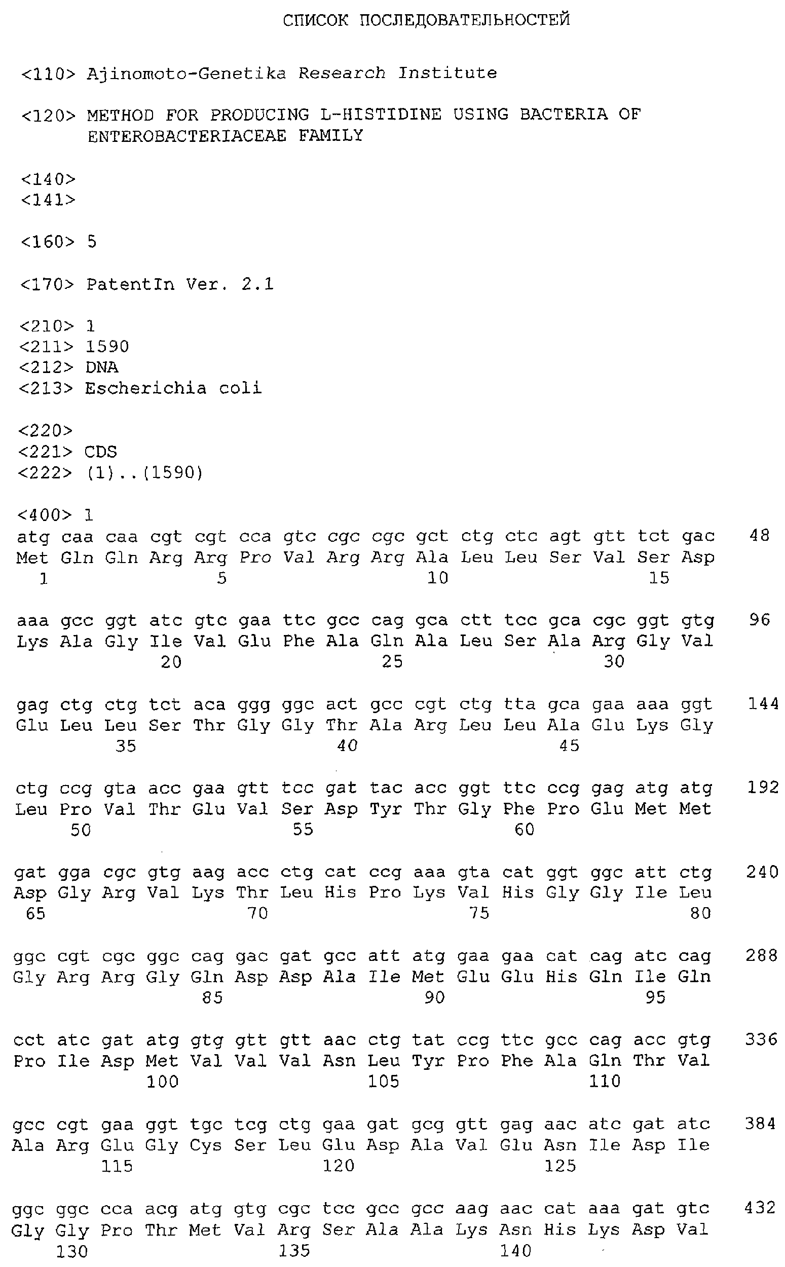 Область техники. Настоящее изобретение относится к биотехнологии, в частности к способу получения L-аминокислоты, такой как L-гистидин, методом ферментации, и более конкретно к гену, полученному из бактерии Escherichia coli. Этот ген является полезным для улучшения продукции L-гистидина. Предшествующий уровень техники Традиционно L-аминокислоты в промышленном масштабе могут быть получены методом ферментации с использованием штаммов микроорганизмов, полученных из природных источников, или их мутантов, специально модифицированных для того, чтобы увеличить продукцию L-аминокислот. Описано множество методов увеличения продукции L-аминокислот, например, путем трансформации микроорганизма рекомбинантной ДНК (см., например, патент США 4278765). Указанные методы основаны на повышении активности ферментов, вовлеченных в биосинтез аминокислот, и/или уменьшении чувствительности целевого фермента к ингибированию продуцируемой L-аминокислотой по принципу обратной связи (см., например, выложенную патентную заявку Японии №56-18596 (1981), WO 95/16042 или патенты США 5661012 и 6040160). В пути биосинтеза L-гистидина фермент имидазолглицеролфосфатсинтаза, кодируемая генами hisH и hisF, катализирует реакцию, в ходе которой высвобождается промежуточное соединение, 5′-фосфорибозил-4-карбоксамид-5-аминоимидазол (AICAR). В то же время первая реакция пути биосинтеза L-гистидина катализируется белком HisG и представляет собой замену С-1 фосфорибозилпирофосфата (PRPP) на N-1 пуринового кольца аденозинтрифосфата (АТФ). Но AICAR является не только побочным продуктом пути биосинтеза гистидина, но также и предшественником в пути биосинтеза пуринов и, следовательно, пуриновых нуклеозидов и нуклеотидов, таких как АМФ и АТФ. Таким образом, превращение AICAR в АМР представляет собой важный процесс для продукции L-гистидина. Ген purH кодирует бифункциональный белок с активностью AICAR трансформилазы (5′-фосфорибозил-4-карбоксамид-5-аминоимидазол трансформилаза) [ЕС 2.1.2,3] и IMP циклогидролазы [ЕС 3.5.4.10], катализирующий предпоследний и последний этапы синтеза de novo инозинмонофосфата (IMP), соответственно (Escherichia coli and Salmonella, Second Edition, Editor in Chief: F.C.Neidhardt, ASM Press, Washington D.C., 1996). Но в настоящее время нет данных, описывающих влияние повышения активности AICAR трансформилазы-IMP циклогидролазы, кодируемой геном purH, для улучшения продукции L-гистидина с использованием штаммов семейства Enterobacteriaceae. Описание изобретения Целью настоящего изобретения является увеличение продуктивности штаммов, продуцирующих L-гистидин, и предоставление способа получения L-гистидина с использованием указанных штаммов. Данная цель была достигнута путем обнаружения того факта, что ген purH, кодирующий AICAR трансформилазу (5′-фосфорибозил-4-карбоксамид-5-аминоимидазол трансформилаза) [ЕС 2.1.2.3] и IMP циклогидролазу [ЕС 3.5.4.10], не вовлеченную в путь биосинтеза целевой L-аминокислоты, увеличивает продукцию L-гистидина в случае, когда дополнительные копии указанного гена введены в клетки соответствующего штамма – продуцента. Таким образом, было совершено настоящее изобретение. Настоящее изобретение включает в себя следующее. 1. Бактерия – продуцент L-гистидина, принадлежащая к семейству Enterobactericiceae, обладающая повышенной активностью любого из ферментов, участвующих в превращении 5′-фосфорибозил-4-карбоксамид-5-аминоимидазола (AICAR) в инозин-5′-монофосфат (