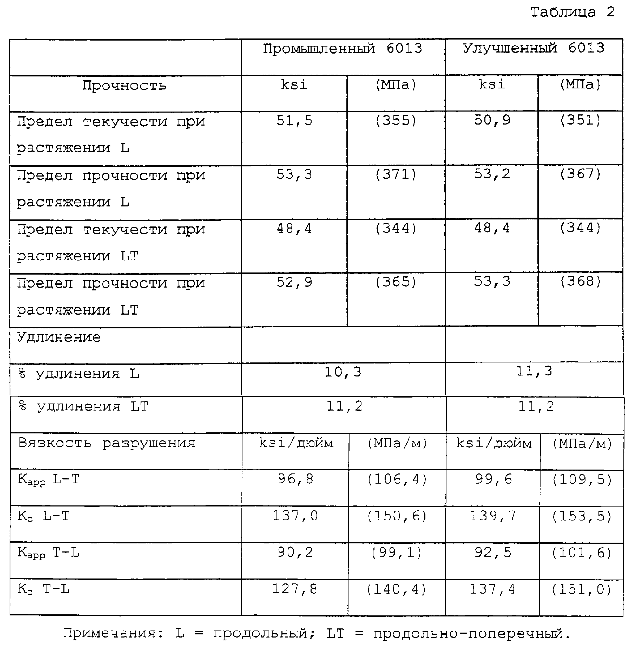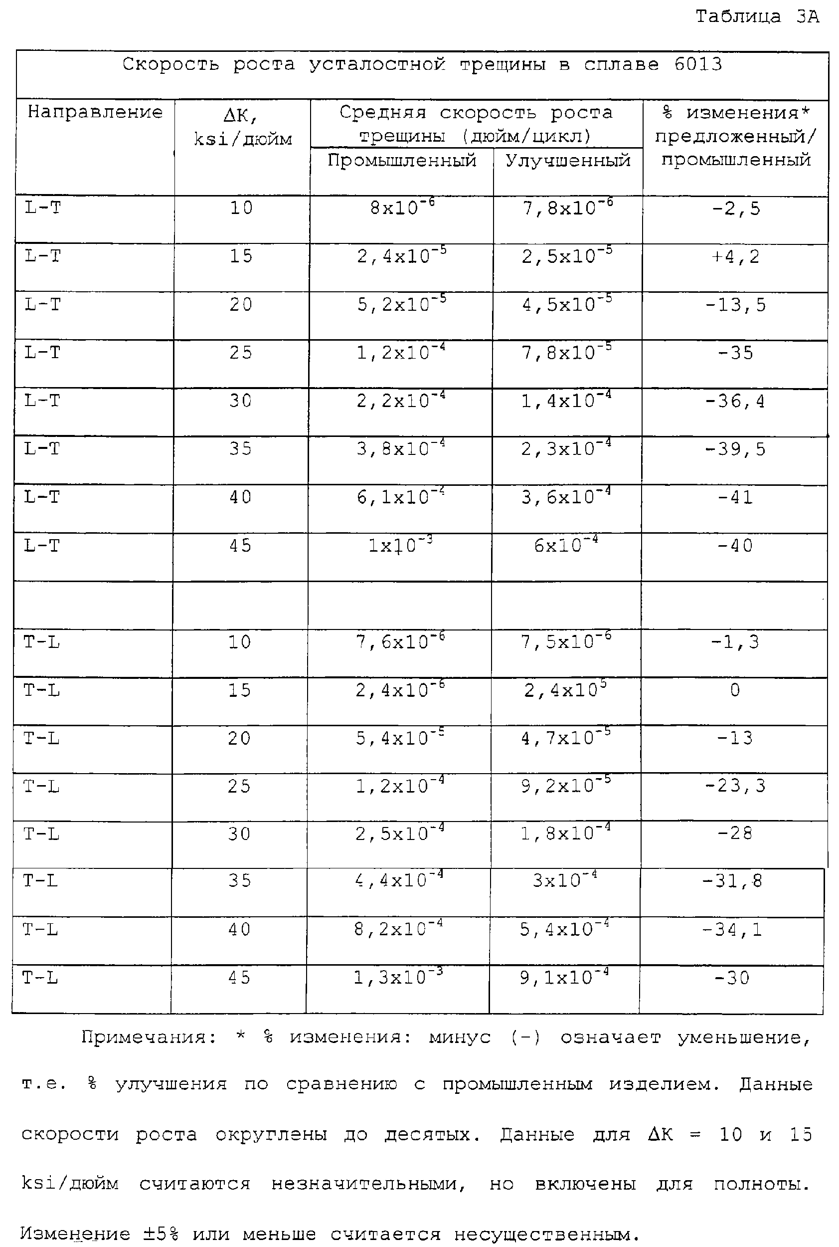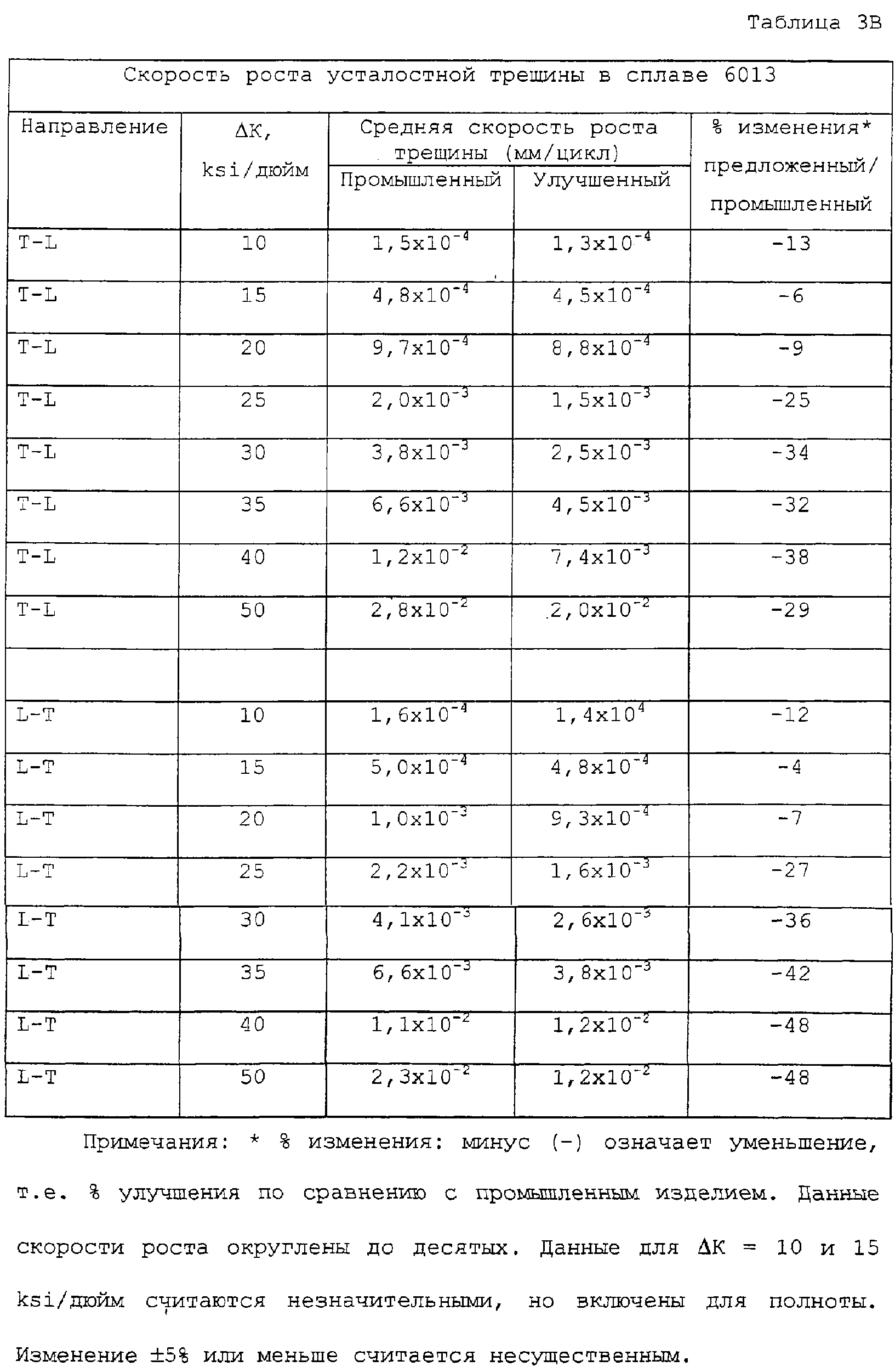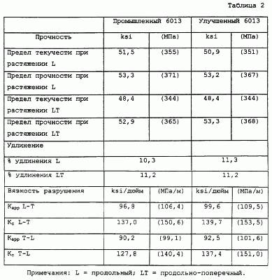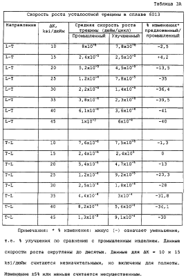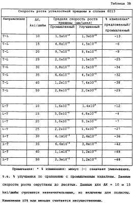 В таблице 2 приведены прочностные свойства для листа марки Т6, полученного в соответствии с изобретением, а в таблицах 3А и 3В приведены скорости роста усталостной трещины и дано сравнение с промышленным листом из плакированного дюралюминия серии 6013-Т6. Можно заметить, что значения предела прочности и предела текучести при растяжении и сжатии у предложенного изделия и промышленного 6013 похожи. Однако вязкость разрушения предложенного изделия несколько выше (или, по меньшей мере, не ниже), а усталостные свойства намного лучше. Скорость роста усталостной трещины снижена на 25 или 30% или больше при достаточно высоких значениях Уменьшение скорости роста усталостной трещины при уровнях