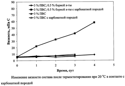 Состав закачивают через нагнетательные скважины в тело и основание плотины или другого гидротехнического сооружения при давлении, меньшем давления гидроразрыва грунта. За счет сцепления состава с породой фильтрационное сопротивление потоку воды увеличивается, вязкость состава возрастает (фиг.1), скорость потока замедляется. Через определенное время при температуре 0-10°С образуется гель, создающий противофильтрационный экран. Скорость потока становится равной нулю, то есть поток останавливается. В дальнейшем при сезонном замораживании – размораживании прочностные характеристики противофильтрационного экрана улучшаются.