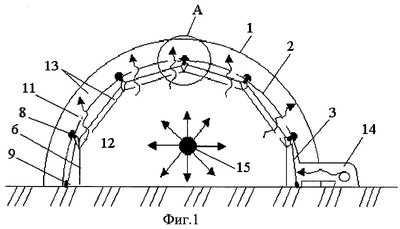 На фиг.1 изображен общий вид пневматического сооружения, схема движения воздуха из помещения в зазоры, образуемые оболочкой, утеплителем и полиэтиленовым материалом; фиг.2 – узел А, конструкция подвеса к тканепленочному утеплителю полиэтиленового материала, а также схема пропуска воздуха из помещения в зазоры.