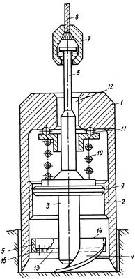 Скважинный ловитель работает следующим образом. Подвешенный на канате 8 грузоподъемного механизма ловитель опускают в скважину, при этом масса корпуса 1 определена из расчета равенства его массы полной рабочей деформации пружины 10. Шнек 3 при полностью сжатой пружине 10 в подвешенном положении ловителя находится в своем верхнем положении, при котором нижний торец корпуса 1 располагается ниже спиральной лопасти 4 на величину деформации пружины 10. При подходе к забою ловитель притормаживают до скорости 1-3 м/с, т.к. при скорости свободного падения корпус 1 “теряет” вес, пружина 10 находится в разжатом положении, а ловитель – в “неработоспособном” состоянии. В момент установки ловителя на забое с пружины 10 снимается действие веса корпуса 1 и она начинает разжиматься и перемещает с вращением вниз шнек 3 благодаря несамотормозящей приводной паре 2-9. При этом спиральная лопасть 4 захватывает и транспортирует находящиеся на забое посторонние предметы и шлам в шламоприемник 5. Затем ловитель приподнимают на несколько метров над забоем, “заряжая” пружину 10 весом подвешенного на ней корпуса 1, и производят повторный сброс на забой. Мелкие фракции шлама во время спуско-подъема ловителя вымываются из шламосборника 5 благодаря наличию в его днище 13 отверстий 15. Необходимое количество сбрасывании ловителя на забой определяется опытным путем, а качество очистки забоя контролируется визуальным осмотром его шламосборника 5 после подъема из скважины.