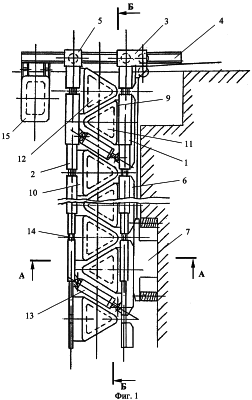Механизированная пневматическая крепь состоит из забойной базовой балки 1 и завальной базовой балки 2. Базовая балка 1 через каретку 3 опирается на удерживающее устройство 4, а базовая балка 2 – через каретку 5. К базовой балке 1 жестко прикреплены лыжи 6 для взаимодействия с выемочным комбайном 7, перемещающегося вдоль линии очистного забоя 8. К базовым балкам 1 жестко прикреплены основания 9, к базовым балкам 2 – основании 10. К основаниям 9 прикреплены треугольной формы четные пневмобаллоны 11, а к основаниям 10 – нечетные пневмобаллоны 12 треугольной формы. К базовым балкам 1 и 2 между четными и нечетными пневмобаллонами шарнирно закреплены пневмодомкраты 13. Базовые балки выполнены переменного сечения и соединены между собой с помощь оси 14, позволяющей изгибаться базовым балкам в плоскости напластования. Удерживающее устройство 4 снабжено вспомогательным пневмобаллонном 15 закрепленным к нему шарнирно.