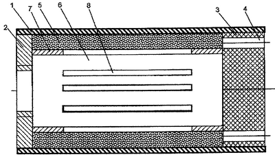 Пористость звукопоглощающего элемента 5 в 2,5…5,0 раз ниже пористости звукопоглощающего элемента 3, из которого может быть выполнен выпускной патрубок 3, это предусмотрено для исключения возможного повышения сопротивления глушителя шума, что может существенно повлиять на производительность оборудования.