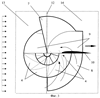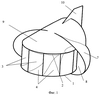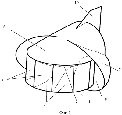 На фиг.1, 2, 3 изображена ветроустановка, где 1 – нижнее основание, 2 – верхний элемент корпуса, 3 – пространственные лопасти, 4 – рабочий канал направляющего аппарата, 5 – центральный выходной канал корпуса, 6 – рабочее колесо, 7 – воздухозаборник, 8 – внутренняя полость воздухозаборника, 9 – сопло, 10 – стабилизатор, 11 – генерирующее устройство, 12 – граница раздела на зоны, 13 – фронтальная зона, 14 – тыльная зона.