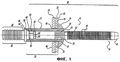 Крепежное устройство 10 приспособлено для установки с помощью установочного инструмента, который может быть выбран из числа хорошо известных в данной области техники, и поэтому в целях упрощения детальное описание этого инструмента здесь опущено. Однако необходимо заметить, что конструкция такого инструмента включает зажимной кулачок, приспособленный для контактного сцепления с тяговыми канавками 44 стержня 14 с их захватом, в то время как упор инструмента находится в контактном сцеплении с увеличенной головкой 26 втулки, которая контактирует с внешней, или доступной, поверхностью 65 соединяемой детали 22. При приведении инструмента в действие кулачковый механизм перемещается в осевом направлении во внешнюю сторону от упора, за счет чего между стержнем 14 и втулкой 12 приложено относительное осевое усилие, которое перемещает стержень внутри втулки 12.