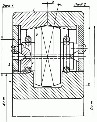 Подшипник качения состоит из разъемного наружного кольца 1, тел качения 2, сепаратора 3, внутреннего кольца 4 и промежуточного звена 5. Тела качения 2 выполнены в виде одноступенчатого ролика, больший диаметр большей стороны ролика выполнен сферическим по форме и контактирует только с дорожками качения с диаметром D1m наружного кольца 1 в двух точках по диаметру ролика Dwm2 с углом контакта ( равен от 12° до 36°, как пример). А меньший диаметр ступеней ролика 2 выполнен цилиндрическим с радиусными кольцевыми проточками, по которым проходит обкатка промежуточного звена 5. Последнее выполнено в виде жесткого тора с увеличенным диаметром по отношению к расчетному. На внутреннем кольце 4 выполнена кольцевая проточка с образованием зазоров под больший диаметр большей ступени ролика 2. Дополнительно на внутреннем кольце 4 выполнены радиусные кольцевые проточки – дорожки качения с диаметром d1m, по которым и происходит контакт расчетного диаметра Dwm1 – меньшего диаметра ступени ролика 2.