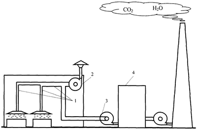 В базовом режиме работы вытяжной вентиляции промышленного предприятия загрязненный воздух рабочей зоны производственного цеха отводят по воздуховодам 1 дутьевым вентилятором 3 в топки котлов котельной установки 4. Загрязнения, содержащиеся в воздухе, удаляемом из рабочей зоны производственного цеха в котельную установку 4, термически обезвреживают в ней и удаляют из нее в атмосферу через дымовую трубу на значительную высоту. Вентилятор вытяжной вентиляции 2 используют в качестве резервного, например, при останове котлов котельной установки 4.