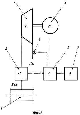 Установка, выполненная по “низкотемпературной” схеме (фиг.1), включает магистраль 1 природного газа высокого давления, на которой последовательно установлены электрический резистивный нагреватель 2 и турбодетандер 3, кинематически связанный с электрогенератором 4. Нагреватель 2 подключен к электрогенератору 4 через блок управления 5, электрически связанный с датчиком температуры (термопарой) 6.