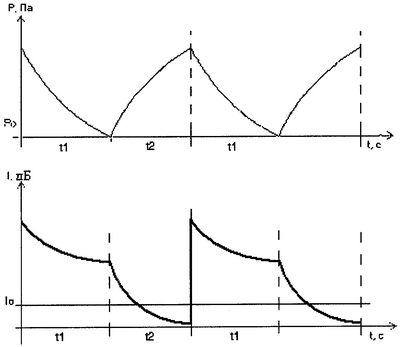 Практические значения величин t2 пауз и времени t1 в зависимости от типа и производительности используемого компрессорного оборудования, а также формы и размера замкнутого объема можно изменять в широком диапазоне от минимального времени, необходимого для начала формирования устойчивых колебаний до нескольких секунд.