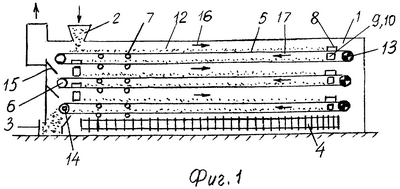 Подаваемый через загрузочное приспособление 2 сыпучий груз 12 равномерным слоем размещается на на самой верхней ветви 5 ленты и транспортируется ею в направлении 16. В конце этой ветви в зоне размещения оборотного барабана 6 сыпучий груз 12 набегает на двусторонний плужковый сбрасыватель 8, который перегружает его на два наклонных желоба 9 и 10. С наклонных желобов 9 и 10 сыпучий груз 12 подается на нижележащую ветвь 5 ленты, которая перемещает сыпучий груз 12 в противоположном направлении 17 до следующего двустороннего плужкового сбрасывателя 8, с помощью которого сыпучий груз 12 снова перегружается по наклонным желобам 9 и 10 на ветвь 5 ленты, расположенную еще ниже, и т.д. до самой нижней ветви 5 ленты. При перемещении по всем ветвям 5 ленты сыпучий груз 12 обдувается нагретым воздухом из калорифера 4 и высушивается до требуемой влажности.