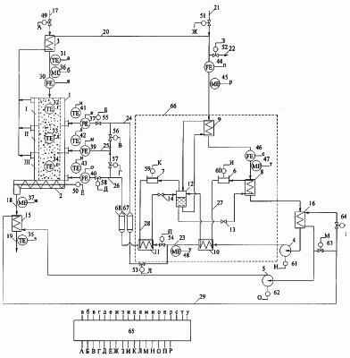 Схема содержит: I, II, III – соответственно первая, вторая и третья зоны сушки; 1 – сушилка; 2 – устройство для выгрузки высушенного продукта; 3 – камера нагрева; 4, 5 – вентиляторы; 6, 7 – компрессор теплонасосной установки соответственно первой и второй ступени; 8, 9 – испаритель соответственно первой и второй ступени; 10, 11 – конденсатор соответственно первой и второй ступени; 12 – промежуточный сосуд; 13, 14 – регулирующие вентили; 15 – теплообменник; 16 – теплообменник-рекуператор; линии: 17 – подачи влажного продукта в сушилку; 18 – отвода высушенного продукта; 19 – отвода охлажденного продукта; 20 – рециркуляции сушильного агента; 21 – подпитки отработанного сушильного агента свежим; 22 – сброса отработанного сушильного агента; 23 – подачи осушенного сушильного агента в конденсатор второй ступени; 24, 25, 26 – подачи осушенного сушильного агента соответственно в I, II, III зонах сушки; 27, 28 – рециркуляции хладоагента соответственно в первой и второй ступенях теплонасосной установки; 29 – линия рециркуляции охлаждающего воздуха; датчики: 30, 31 – расхода и температуры влажного продукта; 32, 33, 34 – температуры продукта соответственно в I, II, III зонах сушки; 35 – температуры охлажденного продукта; 36, 37 – влажности влажного и высушенного продукта; 38, 39, 40 – расхода сушильного агента соответственно в I, II, III зонах сушки; 41, 42, 43 – температуры сушильного агента на входе в I, II, III зонах сушки; 44, 46 – расхода сушильного агента перед испарителем соответственно второй и первой ступени; 45, 47 – влагосодержания сушильного агента перед испарителем соответственно второй и первой ступени; 48 – влагосодержания сушильного агента после конденсатора первой ступени; 49-64 – исполнительные механизмы; 65 – микропроцессор; 66 – двухступенчатая теплонасосная установка; 67, 68 – ресиверы.