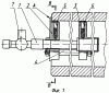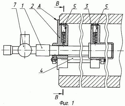Верхние перья фланцев снабжены подпружиненными грибками 5. Штанга 1 установлена относительно переднего фланца 2 с возможностью радиальной регулировки установочными винтами 6. Каждое перо переднего фланца 2 имеет буртик “А”. На торцевой поверхности переднего фланца 2 в осевой вертикальной плоскости выполнена риска “Б” в виде канавки. На штанге I закреплено оптическое, световое или лазерное приспособление 7, позволяющее на расстоянии определять положение оси штанги.