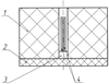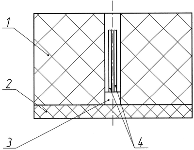В качестве примера конкретного выполнения можно привести устройство, состоящее из основного заряда 1 (ВВ – малочувствительный взрывчатый состав на основе триаминотринитробензола), узла инициирования 2, размещенного под основным зарядом ВВ и представляющего собой матрицу с каналами, заполненными пластичным ВВ, узла электрического задействования 3 (электродетонатор). В основном заряде выполнен сквозной канал. Диаметр сквозного канала основного заряда 15 мм. Узел инициирования склеен клеем ЭЛ 20 с основным зарядом. Электродетонатор 3 с подводящими проводами 4 поджимается к узлу инициирования пружиной.