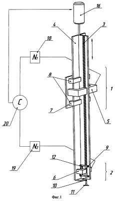 В момент касания щупа 10 с поверхностью 11 продолжается счет на СГ1 – 5, откуда поступают импульсы n1iкас и числа N1iкac с блока 18 на сумматор 20. Одновременно начинается движения Риз- 3 относительно Рин2 – 9 и от СГ2-6 на блок 19 начинают поступать измерительные сигналы n2iкас, которые преобразуются этим блоком в величины N2iкac, которые подаются затем на сумматор 20. До и после момента касания Риз – 3 продолжает первоначальное движение. На сумматоре сравниваются данные N1iкac и N2iкac. Так как после касания величины перемещения от двух головок равны, но попадают с разным знаком на сумматор, то после касания алгебраическая сумма N1iкас-N2iкас практически равна нулю.