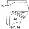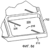 На фиг.7а показан вид в перспективе микрозеркала 702 согласно альтернативному варианту осуществления изобретения. Торсионный подвес 206 в этом варианте осуществления ориентирован по диагонали относительно разделительной опорной стенки 210 и делит зеркальную пластину 204 на две части или стороны: первую сторону 704 и вторую сторону 706. С зеркалом 702 связаны два электрода 126: один электрод 126 для первой стороны 704 и один электрод 126 для второй стороны 706. Это позволяет каждой стороне 704, 706 притягиваться к одному из находящихся под ними электродов 126 и поворачиваться вниз, что обеспечивает более обширный диапазон углового движения при той же высоте опорной стенки 210 по сравнению с зеркалом, изображенным на фиг.2-6. На фиг.7b показан более детальный вид зеркала 702, где изображена зеркальная пластина 702, подвес 206 и опорная стенка 210. На фиг.7с и 7d изображены нижняя сторона единичного зеркала 702 и более детальный вид внутреннего угла зеркала 702. Согласно другим вариантам осуществления, подвес 206 может располагаться по существу параллельно одной из сторон зеркальной пластины 204, а не диагонали, но располагаться так, чтобы делить зеркальную пластину 204 на две части 704, 706.
