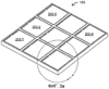 На фиг.11 показан вид в перспективе одного варианта осуществления электродов 126, сформированных на второй подложке 107. Согласно этому варианту осуществления, каждое микрозеркало 202 имеет соответствующий электрод 126. Электроды 126 в этом иллюстрируемом варианте осуществления изготавливают так, чтобы они возвышались над остальной схемой на второй подложке 107. Как показано на фиг.11, материал на сторонах электродов 126 снижается от верхней поверхности электродов, образуя пирамидальную форму. В других вариантах осуществления, электроды 126 располагаются на одном уровне с остальной схемой на второй подложке 107, не выступая над схемой. В одном варианте осуществления изобретения, электроды 126 представляют собой отдельные алюминиевые площадки размером примерно 10х10 микрон. Эти электроды 126 изготавливают на поверхности второй подложки 107. Большая площадь поверхности электродов 126 в этом варианте осуществления обеспечивает относительно низкие напряжения адресации, необходимые для оттягивания зеркальной пластины 204 вниз на механические ограничители для получения определенного полного углового отклонения зеркальных пластин 204.