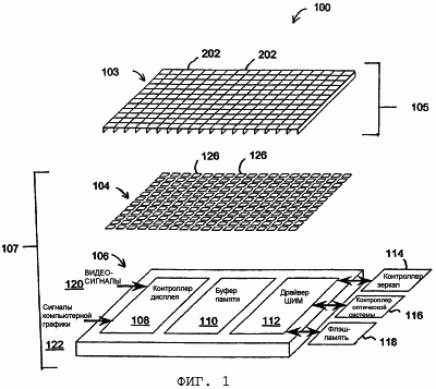 Третий слой – это слой управляющей схемы 106. Эта управляющая схема 106 имеет схему адресации, которая позволяет управляющей схеме 106 управлять напряжением, подаваемым на выбранные электроды 126. Это позволяет управляющей схеме 106 управлять отклонением зеркал 202 в массиве 103 зеркал посредством электродов 126. Традиционно, управляющая схема 106 также содержит блок 108 управления дисплеем, буферы 110 памяти строк, массив 112 широтно-импульсной модуляции и входы для видеосигналов 120 и графических сигналов 122. Микроконтроллер 114, схема 116 управления оптической системой и флэш-память 118 могут быть внешними компонентами, подключенными к управляющей схеме 106, или, согласно некоторым вариантам осуществления, могут входить в состав управляющей схемы. В различных вариантах осуществления, некоторые из вышеперечисленных компонентов могут отсутствовать, могут находиться на отдельной подложке и подключаться к управляющей схеме 106, или другие дополнительные компоненты могут входить в состав управляющей схемы 106 или быть подключены к управляющей схеме 106.