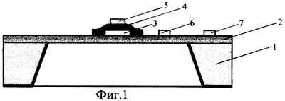 На фиг.1 приведен разрез варианта устройства со сплошной мембраной, а на фиг.2 – с разделяющими щелями. Кристалл датчика содержит кремниевую рамку-основание (1), на которой расположена диэлектрическая мембрана (2), из четырех чередующихся слоев SiO2 и Si3N4. Толщина слоев SiO2 – 0,5 мкм, Si3N4 – 0,15 мкм. На поверхности мембраны на слое SiO2 выполнен нагревательный резистор (3) из поликремния или тугоплавкого металла, поверхность которого защищена слоем диэлектрика Al2O3 или алмазоподобной пленкой (4). Над нагревательным резистором (3) на слое диэлектрика (4) расположен чувствительный платиновый резистор (5). Сбоку относительно резистора (5) выполнен боковой платиновый резистор (6) и платиновый резистор (7) на рамке-основании (1). И в варианте устройства на фиг.2 выполнены щели (8) на всю длину мембраны.