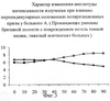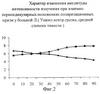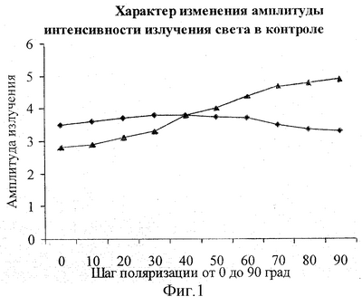 На фиг.1 представлен характер изменения интенсивностей поляризованного излучения, проходящего через образец сыворотки крови, в контрольной группе (доноры). У больных средней степени тяжести характер кривой несколько изменяется, принимая более асимметричную форму с явным уменьшением “весовой” доли левого плеча (фиг.2). Причем угол пересечения кривых поляризации смещается от отметки 38 градусов (в контрольной группе) в сторону уменьшения (табл.1), достигая среднестатистических значений в группе больных средней степени тяжести порядка 34 градусов.