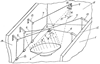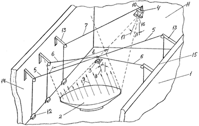 Безэховая камера 1 снабжена системой натяжных тросов 5 и регулировочных тросов 6, 7, выполненных из упругого радиопрозрачного материала, например капрона. На натяжных тросах 5 закреплена с возможностью перемещения посредством регулирования длины тросов 5, 6 приемная технологическая антенна 3, причем ее оптическая ось 8 направлена перпендикулярно фазовому фронту отражаемой рефлектором 2 электромагнитной волны 9. Система передающих рупорных облучателей 4 подсоединена к регулировочному тросу 7 и установлена на консоли 10, которая выполнена из прочного жесткого материала, пропускающего радиоволны – радиопрозрачного материала, например древесины, и закреплена на стене 11 безэховой камеры 1, стенд снабжен натяжными устройствами 12, например, выполненными в виде лебедок для обеспечения натяжения и регулирования длины тросов 5, 6, 7 при регулировании и настройке приемной технологической антенны 3 и системы передающих рупорных облучателей 4 относительно рефлектора 2. Зона сканирования обозначена буквой l. Натяжной трос 5 и регулировочные тросы 6, 7 подвешены на блоках кронштейнов 13, выполненных из прочного жесткого радиопрозрачного материала (древесины) и закрепленных на стенах 14, 15.