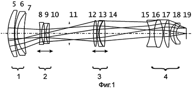 Объектив с переменным фокусным расстоянием (фиг.1) содержит четыре оптически связанные компонента 1-4. Компонент 1 включает линзы 5-7, компонент 2 – линзы 8-10, компонент 3 – линзы 12-14, компонент 4 – линзы 15-19. Между компонентами 2 и 3 расположена апертурная диафрагма 11. Компоненты 2 и 3 выполнены с возможностью перемещения вдоль оптической оси. Фокусное расстояние объектива увеличивается за счет сближения компонентов 2 и 3.