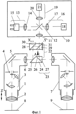 Известен микроскоп сравнения, содержащий две ветви сравнения, каждая из которых включает первый объектив, устройство изменения увеличения, второй объектив, блок наблюдения и регистрации и блок совмещения полей изображений, расположенный между вторыми объективами ветвей сравнения и блоком наблюдения и регистрации. Работа микроскопа сравнения основана на формировании обеими ветвями сравнения промежуточных изображений объектов в блоке совмещения полей изображений в плоскости, совмещенной с плоскостью предметов блока наблюдения и регистрации. При перемещении блока совмещения полей изображений в направлении, параллельном оптическим осям вторых объективов ветвей сравнения, наблюдают и регистрируют в крайних положениях блока совмещения полей изображений изображение объекта, формируемое либо первой, либо второй ветвью сравнения, а в промежуточных положениях – части изображений, формируемых обеими ветвями сравнения. Фокусировку на резкость изображений, формируемых ветвями сравнений, осуществляют перемещениями предметных столиков вдоль оптической оси первых объективов [1].