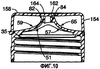 В варианте укупорочной системы 30 крышка 150 включает боковую стенку или юбку 154, от которой шарнир 152 проходит к корпусу 32. Юбка 154 крышки имеет установочную поверхность 156 крышки. Когда крышка 150 закрыта, установочная поверхность 156 зацепляется с кольцевым заплечиком 36, образованным на корпусе 32 на верху юбки 34 корпуса.