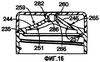 Фиг.15 и 16 показывают другой вариант укупорочной системы 230 согласно изобретению. В этом варианте выполнения передняя стенка 244 выливного носика проходит под плавным наклоном от площадки 235 к краевой поверхности 282 передней стенки, в соответствии с конической геометрией, но с более плавным наклоном, чем в варианте выполнения, показанном на фиг.1-14. Кроме того, краевая поверхность 282 передней стенки образует больший угол с наружной поверхностью 259 передней стенки выливного носика по сравнению с соответствующими поверхностями в варианте выполнения, показанном на фиг.1-14. Это обеспечивает более гладкую отделку, которую легко чистить. Передняя стенка 244 выливного носика включает внутреннюю переходную поверхность 251, которая проходит от площадки 235, по меньшей мере, частично, к периферической поверхности 286 выдачного отверстия, в соответствии с конической геометрией, предпочтительно параболой. Аналогично, задняя стенка 246 выливного носика включает любую внутреннюю переходную поверхность 257, которая проходит в соответствии с конической геометрией, которая является более крутой и поэтому отличается от конической геометрии внутренней переходной поверхности 251 передней стенки выливного носика. Как видно на фиг.16, элемент 260, уплотняющий отверстие, снабжен угловой краевой поверхностью 266, которая обеспечивает вход элемента 260, уплотняющего отверстие, в угловое выдачное отверстие 252, когда крышка 250 закрыта.