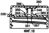 Фиг.17 и 18 – еще один вариант укупорочной системы 330 согласно изобретению. В этом варианте выполнения стенки выливного носика образованы по существу вертикальным участком и более резким переходом от площадки 335. Передняя стенка 344 выливного носика включает внутреннюю переходную поверхность 351, которая имеет по существу постоянный радиус, проходящий от площадки 335 к вертикальному участку 366 передней стенки 344 выливного носика. Аналогично, задняя стенка 346 выливного носика включает внутреннюю переходную поверхность 357, которая имеет по существу постоянный радиус, проходящий от площадки 335 к вертикальному участку 366. Наружные переходные поверхности 359 и 365 образованы в виде изогнутых поверхностей по существу постоянного радиуса. В отличие от вышеописанных вариантов выполнения элемент 360, уплотняющий отверстие, в этом варианте выполнения приспособлен для зацепления с наружной поверхностью выливного носика 338. Для этого выливной носик 338 снабжен сужающейся наружной поверхностью 371 (фиг.17), проходящей по его периферии. Аналогично, элемент 360, уплотняющий отверстие, снабжен внутренней сужающейся поверхностью 362. Также, в отличие от вышеописанных вариантов выполнения, отверстие расположено не под углом относительно площадки 335.