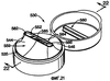 Фиг.21 и 22 показывают еще один вариант укупорочной системы 530 согласно изобретению. В этом варианте выполнения выдачное отверстие 552 расположено под другим углом по сравнению с вариантом выполнения, показанном на фиг.1-14. То есть передняя стенка 544 выливного носика проходит по существу на ту же высоту от площадки 535, как и задняя стенка 546 выливного носика. Как передняя стенка 544, так и задняя стенка 546 выливного носика включают внутренние переходные поверхности. Внутренние переходные поверхности 551 передней стенки выливного носика проходят в соответствии с конической геометрией от площадки 535 к периферической поверхности 586 выдачного отверстия. Внутренняя переходная поверхность 557 задней стенки выливного носика проходит в соответствии с конической геометрией от площадки 535 к периферической поверхности 586 выдачного отверстия. Наружные переходные поверхности 559, 565 также выполнены на передней стенке 544 выливного носика и задней стенке 546 выливного носика соответственно. Как более подробно видно на фиг.22, периферическая поверхность 586 выдачного отверстия включает сужающуюся внутрь поверхность 585, которая проходит внутрь от краевой поверхности 582 передней стенки выливного носика и краевой поверхности 584 задней стенки выливного носика с образованием посадки с натягом с элементом 560, уплотняющим отверстие, когда крышка находится в закрытом положении, показанном на фиг.22.