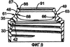 Фиг.7-9 представляют собой виды в сечении вдоль линий 7-7, 8-8 и 9-9 на фиг.3 соответственно. В этом варианте выполнения внутренние переходные поверхности боковых стенок выливного носика 38 не включают коническую геометрию. Предпочтительно левая стенка 48 и правая стенка 49 выливного носика включают внутренние поверхности, которые проходят, в общем, в вертикальном направлении и которые могут включать сужающийся участок, проходящий внутрь к периферической поверхности 86 выдачного отверстия. Однако специалисту в данной области будет понятно, что коническую геометрию можно использовать на внутренних поверхностях левой и правой стенок выливного носика в объеме данного изобретения. Левая стенка 48 выливного носика включает внутреннюю поверхность 68, которая включает, в общем, вертикальную поверхность и сужающуюся внутрь поверхность, проходящую по направлению к периферической поверхности 86 выдачного отверстия. Левая стенка 48 выливного носика также включает наружную поверхность 61, которая проходит в соответствии с конической геометрией от площадки 35 к краевой поверхности 87 левой стенки выливного носика. Аналогично, правая стенка 49 выливного носика включает внутреннюю поверхность 66, которая имеет, в общем, вертикальную поверхность и сужающуюся внутрь поверхность. Правая стенка 49 выливного носика также включает наружную поверхность 63, которая проходит от площадки 35 к краевой поверхности 87 правой стенки в соответствии с конической геометрией.