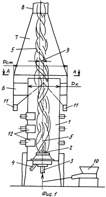 Известно устройство для изготовления стеклянных микрошариков (пат. США №3190737, кл. С 03 В 19/10, 1965 г. – аналог), включающее вертикальную камеру, расширяющуюся вверх телескопически соединенными цилиндрическими частями, узел подачи стеклопорошка в камеру через центр горелки, установленной снизу камеры, узлы закрутки вторичного воздуха. В верхней части цилиндрической камеры установлен бункер для отделения газообразных продуктов горения от микрошариков и удаления этих газов через воздуховод, расположенный вверху бункера. Днище бункера выполнено в виде двух диаметрально сходящихся ячеек для удобства выгрузки микрошариков.