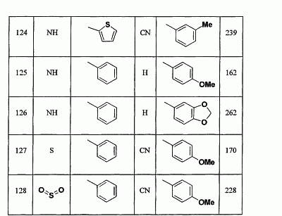 Протокол связывания: инкубируют 20,8 мкг мембран (человеческие рецепторы аденозина A2b, трансфекцированные в клетки НЕК-293, источник: Receptor Biology, Inc.), буфер (50 мМ Трис-HCl, 10 мМ MgCl2, 1 мМ ЭДТК, 0,1 мМ бензамидина, 2 U/мл аденозиндеаминазы, рН 6,5), 32,4 нМ [3Н]DPCPX (8-циклопентил-1,3-дипропилксантин) (800000 расп./мин) и 100 мкМ NECA (5′-N-этилкарбоксамидоаденозин) для определения неспецифического связывания или тестируемого соединения в общем объеме 100 мкл в течение 30 минут при комнатной температуре. Фильтруют через фильтры из стекловолокна Whatman GF/B (предварительно пропитанными 0,5% полиэтиленимином), четырежды промывают 1 мл ледяного 50 мМ Трис-HCl (рН 6,5) в 96-ячеечном Brandel Cell Harvester. Определение активности: в 96-ячеечном планшете в присутствии HiSafe-3 коктейля в счетчике бета-излучения (1450 Microbeta, Wallac). Ингибирование [%]=100 – ((активность в присутствии тестируемого соединения – неспецифическая активность)/(общая активность – неспецифическая активность))*100.