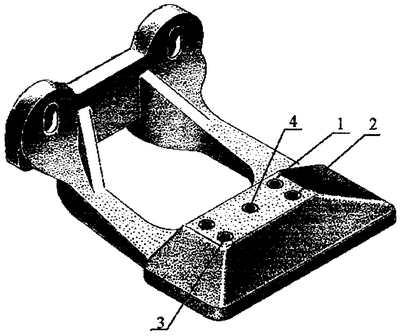 На чертеже изображена конструкция башмака. Конструкция состоит из стального корпуса 1, в котором в его части, соприкасающейся при работе с контактным рельсом, посредством резьбы установлено от трех до двенадцати стаканов 2, выполненных из медного сплава. Внутри стаканов, расположенных по периферии (3-5 штук), находится наполнитель 3, представляющий из себя токопроводящее поверхностно-активное вещество, способствующее качественному нанесению материла стаканов на поверхность трения. Внутри остальных стаканов находится наполнитель 4, способствующий возникновению при трении башмака о рельс эффекта безызносности (избирательного переноса при трении). В результате резко (до 12 раз) снижается износ башмаков и контактного рельса.