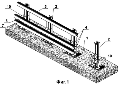 Горизонтальные балки 4 прикреплены к стойкам 2 по высоте, считая от поверхности дорожного покрытия до оси балок, на расстоянии от 250 до 350 мм, от 500 до 680 мм и от 1050 до 1450 мм соответственно для балок верхнего 5, среднего 6 и нижнего 7 ярусов при трехъярусном исполнении и от 250 до 350 мм и от 600 до 700 мм соответственно для балок нижнего 7 и верхнего 5 ярусов при двухъярусном исполнении.