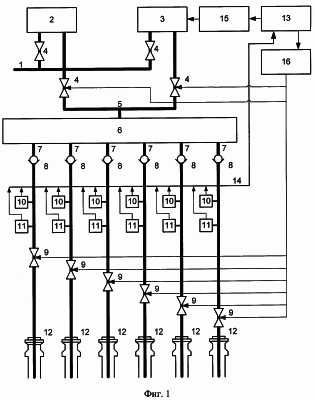 Система ППД (фиг.1) содержит питающую сеть 1, основную насосную станцию 2 высокой производительности, дополнительную насосную станцию 3 малой производительности объемного типа, запорную арматуру 4, подводящий водовод 5, водораспределительный блок 6, напорную сеть 7, отсекающие устройства 8, запорно-регулирующую аппаратуру 9, датчики 10 давления, датчики 11 объемного расхода закачанной жидкости, установленные на устье каждой нагнетательной скважины 12, кустовой контроллер 13 канал 14 передачи информации от датчиков 10, 11 к кустовому контроллеру 13, преобразователь 15 частоты напряжения, блок 16 управления запорно-регулирующей аппаратурой 9.