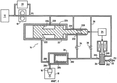 Система впрыска топлива в турбомашине схематично представлена на фиг.1 и 2. Система содержит топливный насос 10 высокого давления, который забирает топливо из топливного бака 12 для его подачи через дозирующее топливное устройство 14 к форсункам 16 камеры 18 сгорания турбомашины. Клапан типа перепускного клапана 20 подсоединен параллельно насосу 10 для перепуска или рециркуляции топлива при избыточной подаче. Высокое давление на напорной стороне насоса 10 обозначено, как Р1.