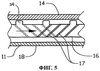 На фиг.5 и 6 показан второй вариант конструктивного исполнения предлагаемого в изобретении охлаждающего канала камеры сгорания ракетного двигателя, в котором для образования направляющих поток охлаждающей жидкости поверхностей используется отдельный элемент – вставка 16, выполненная в виде центрального стержня с наружной резьбой 17. Вставка 16 прочно крепится внутри охлаждающего канала. На внешней поверхности вставки 16 имеются упоры 24, удерживающие центральный стержень вставки на определенном расстоянии от стенки 14 охлаждающего канала. Такие упоры выполнены в виде радиальных выступов, расположенных на соответствующем расстоянии друг от друга вдоль оси охлаждающего канала. Из-за отсутствия резьбы 17 на обращенной к внутренней стенке 18 канала стороне вставки она не препятствует свободному течению охладителя вдоль горячей стенки охлаждающего канала.