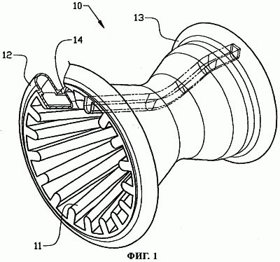 На фиг.1 схематично и в несколько упрощенной аксонометрической проекции в виде сбоку показана камера 10 сгорания ракетного двигателя, изготовленная предлагаемым в настоящем изобретении способом. Такая камера сгорания предназначена для использования в ракетных двигателях, работающих на жидком топливе, например на жидком водороде. Принцип действия таких двигателей хорошо известен и поэтому не требует подробного описания. Камеру 10 сгорания охлаждают охладителем, который предпочтительно также используют в качестве топлива в некоторых типах ракетных двигателей. Изобретение, однако, не ограничено камерами сгорания подобного типа и может найти применение в ряде других случаев.