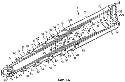 На фиг.1А показан гидравлический подъемник 10 в частично выдвинутом положении с наружной трубчатой ступенью 12, промежуточными трубчатыми ступенями 14, 16, 18 и 20 и внутренней трубчатой ступенью 22. (Для ясности, на фиг.1А показана каждая трубчатая ступень частично выдвинутой; в действительности, трубчатые ступени выступают по одной до тех пор, пока подъемник не выдвинется полностью.) На фиг.1В показан гидравлический подъемник 10 на фиг.1А в полностью собранном положении.