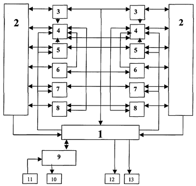 Сигналы от регуляторов первичного воздуха 3, тепловой нагрузки 4, питания котла 5, впрыска 6, общего воздуха 7, разрежения в топке 8 и частоты 9 поступают на главный регулятор 1. А от главного регулятора 1 подают управляющие сигналы на регуляторы 3, 4, 5, 6, 7, 8, 9, тем самым обеспечивая предварительное автоматическое регулирование технологическими процессами в прямоточных котлоагрегатах. Затем управляющий сигнал от измерителя частоты 11 подают на главный регулятор 1 через регулятор частоты 9. Управляющий сигнал от регулятора частоты 9 подают на механизм управления клапаном турбины 10, а регулирование давлением пара в турбине и активной мощностью осуществляют подачей управляющих сигналов от главного регулятора 1 на регуляторы давления пара в турбине 12 и регуляторы активной мощности энергоблока 13 в пределах до 20% от номинальной мощности прямоточных котлоагрегатов, тем самым обеспечивают окончательное автоматическое регулирование технологическими процессами в прямоточных котлоагрегатах.