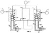 Для облегчения понимания система охлаждения представлена на примере двух топливных форсунок (хотя практически она может охватывать, например, 20 пусковых и 40 основных топливных форсунок). Система охлаждения питается от источника 10 подачи охлаждающего агента (такого как масло, вода или любая другая текучая среда), при этом система охлаждения может быть автономной или неавтономной. Охлаждающий агент вначале проходит через «пусковую» топливную форсунку 12, которая обеспечивает запуск турбомашины и ее работу в режиме малого газа (с низкой мощностью). Далее охлаждающий поток подается параллельно (по принципу четного ряда и нечетного ряда) через две так называемые «основные» топливные форсунки 14, 16, которые функционируют в фазе крейсерского полета, а затем возвращается к источнику 10, замыкая таким образом контур системы охлаждения. Разумеется, система в стандартном исполнении содержит также насос подачи охлаждающего агента, фильтры и различные гидравлические органы регулирования расхода охлаждающего агента.