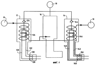 Конструкция пусковых и основных топливных форсунок аэромеханического типа идентична в отношении системы подачи топлива и регулирования его расхода. Система подачи топлива содержит две системы: первичную систему 120, 140 для обеспечения низких расходов и вторичную систему 122, 142 для обеспечения высоких расходов. Предохранительный клапан 124, 144 обеспечивает невозможность обратного потока от топливной форсунки к источнику 18 подачи топлива, а дозирующий клапан 126, 146 регулирует расход во вторичной системе для обеспечения эффективной работы в условиях сообщения первичной и вторичной систем. Кроме того, каждая система в своей заключительной части снабжена завихрителем 128, 130; 148, 150, который за счет своей геометрии обеспечивает распыление (завихривание) топлива.